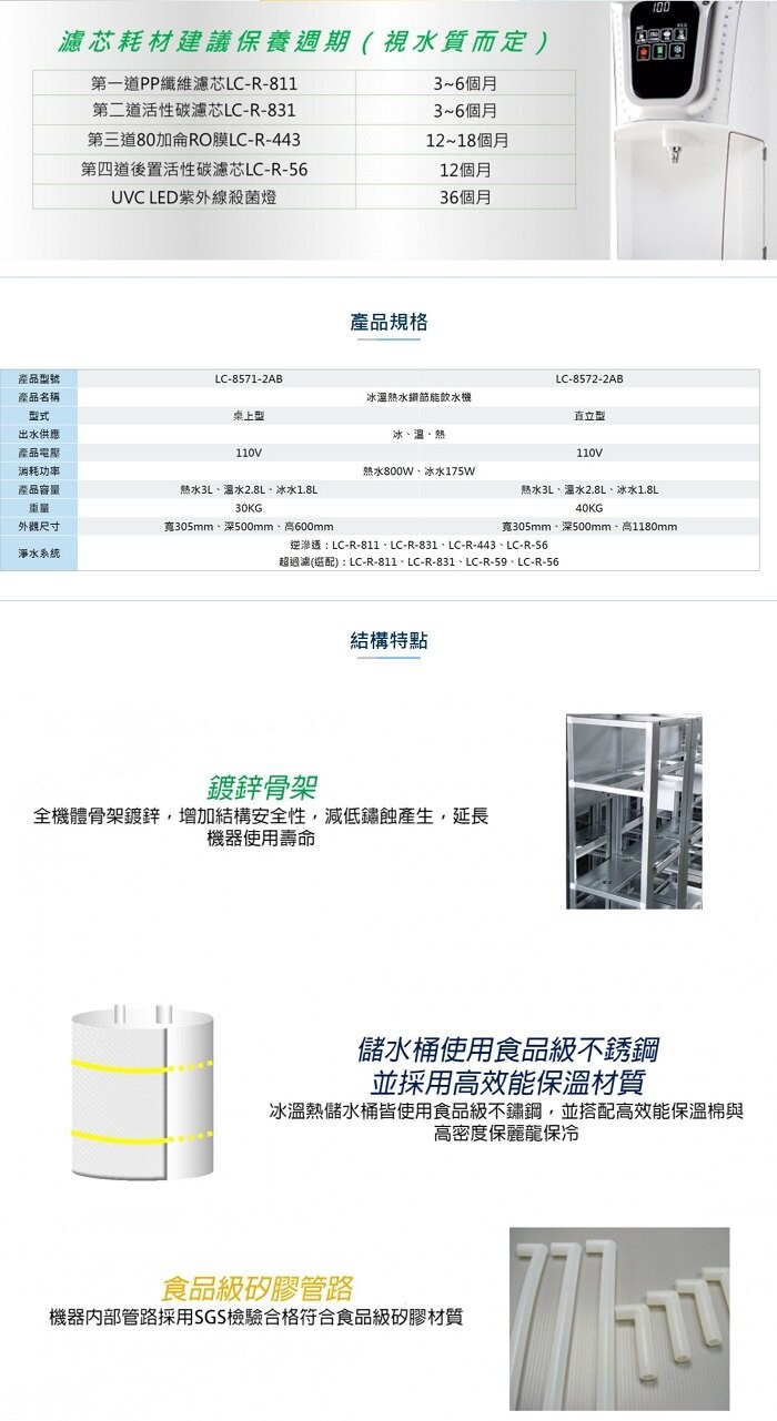 龍泉 LC-8872 直立型冰溫熱氣泡水飲水機 (原LC-7872改款)