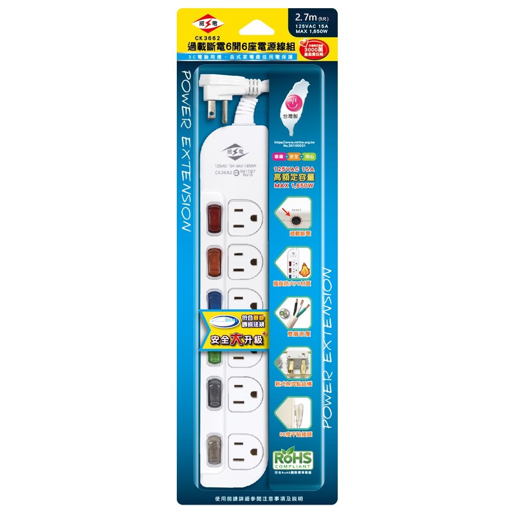 【威電】CK-3762-6 3孔7開6座 防雷擊 突波 電腦 延長線 6尺/1.8M(平貼 拉環 插頭 好拔 過載斷電 電源線組)