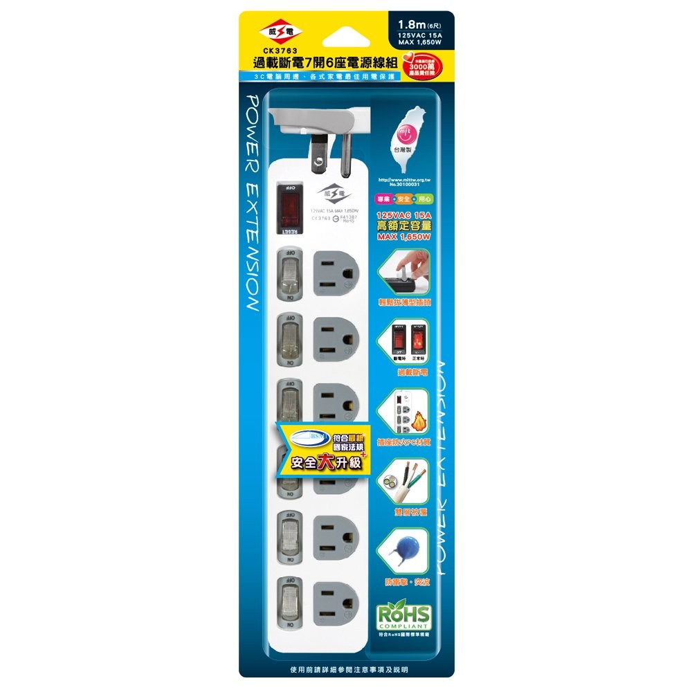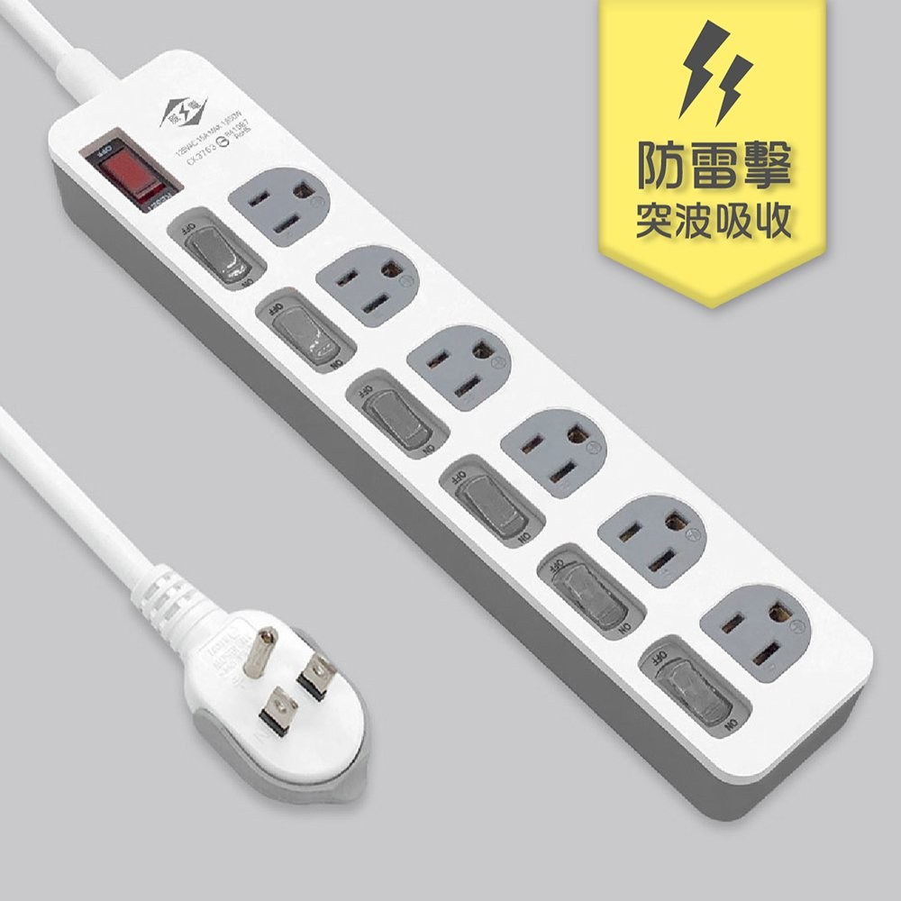 【威電】CK-3763-6 3孔7開6座 防雷擊 電腦 延長線6尺