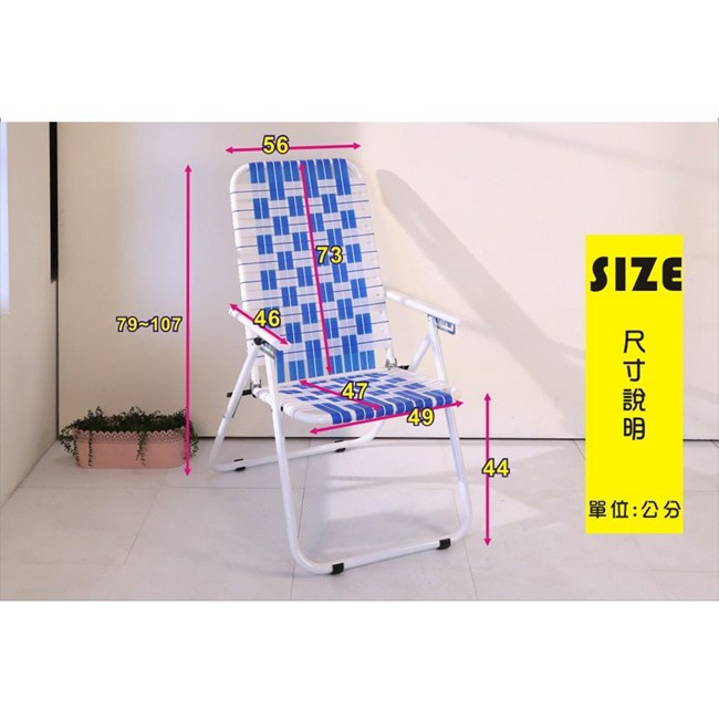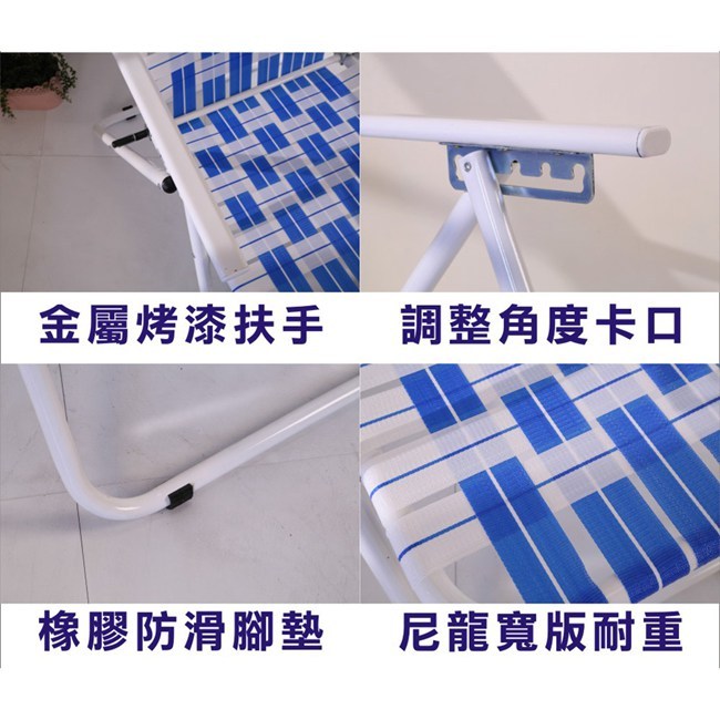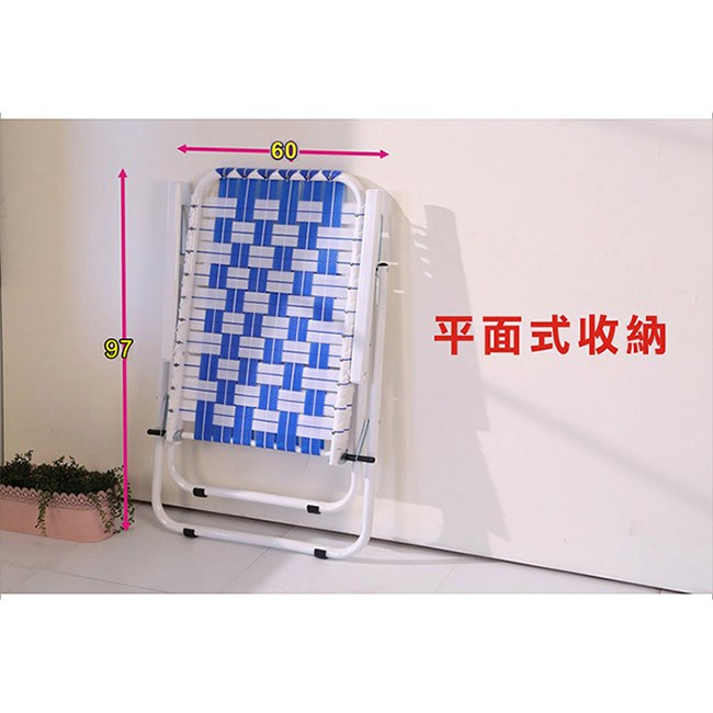 午後的時光,坐在庭院下吹著微微的涼風,是多麼舒服的享受。此時你最不可缺少的就是這張『編織休閒涼椅』,採用寬版尼龍板帶具有彈性,搭配交叉編織法,讓椅面承重力更好。椅背可五段式調整斜度,可依需求調整角度,不論是要坐著看書、坐著休息都能得到最舒適的支撐,讓你不只休息,還可躺下睡個午覺。此款休閒椅輕巧,輕鬆收納展開不費力,不只是放置於家中或庭院,還能攜帶外出郊遊、烤肉,任何活動都少不了它!