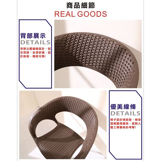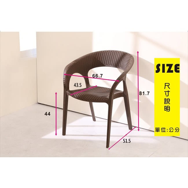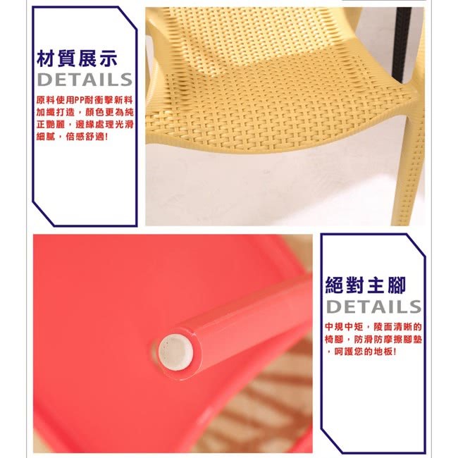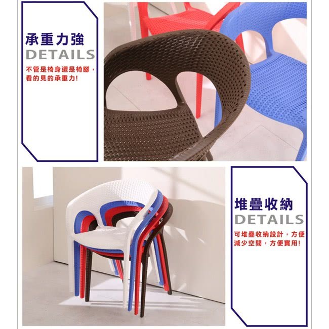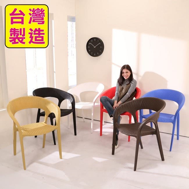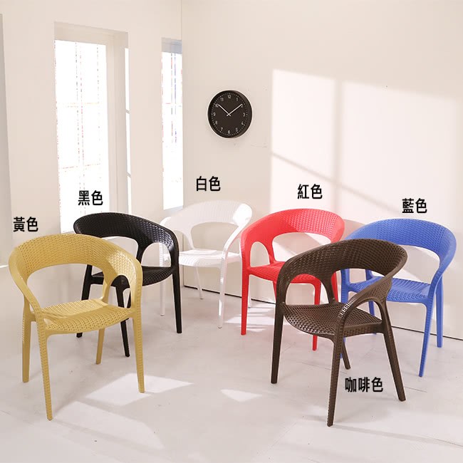 『編織風格餐椅/休閒椅/洽談椅』採用仿藤編工法,讓塑料椅有如藤編的質感及造型,圓弧設計,沒有菱菱角角的不適感,讓人體可以更加的舒適,多色可選,繽紛色彩,可以收納堆疊,空間更多收納空間。台灣製強化塑料材質,經耐重測試,正常使用下可承重100公斤,如此時尚及實用的多功能椅,居家及商業店面使用皆宜,高貴不貴,超值推薦給您。