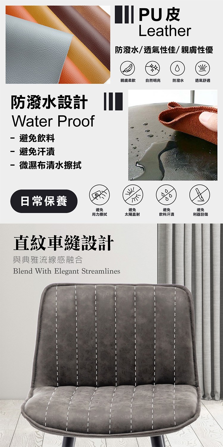 台灣與歐美同步販售、美規設計,防潑水之PU皮面椅座、易於清潔,直紋車縫設計與典雅流線感融合,