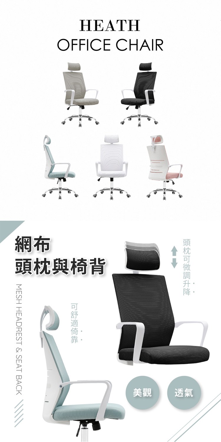 台灣與歐美同步販售、美規設計,網布頭枕與椅背,美觀透氣性高,可調式頭枕設計,可以微調升降,