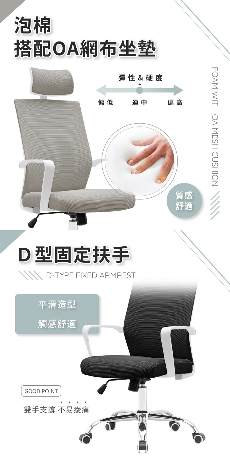 椅背採塑膠射出、腰部良好支撐,泡棉搭配OA網布坐墊,質感舒適,D型固定扶手、雙手可輕鬆倚靠,