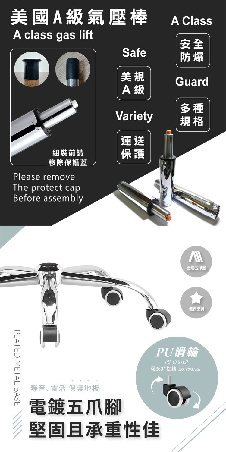 外拉開啟椅座傾仰,可舒適休憩,配備美規A級氣壓棒、安全升降,採電鍍五爪腳,堅固且承重性佳,