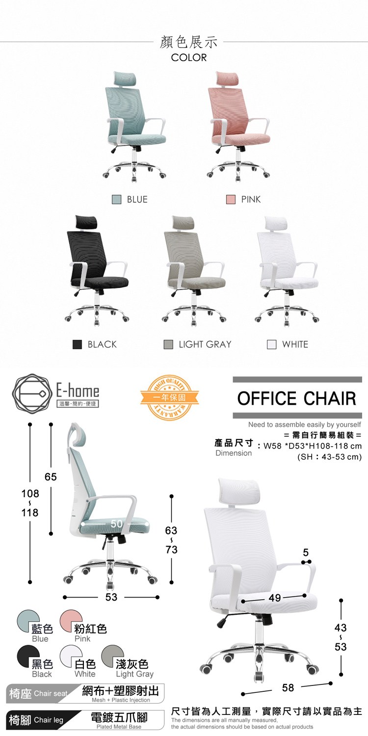 E-home Heath希斯高背扶手半網可調式白框電腦椅-五色可選