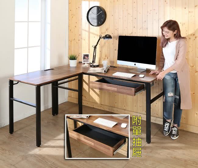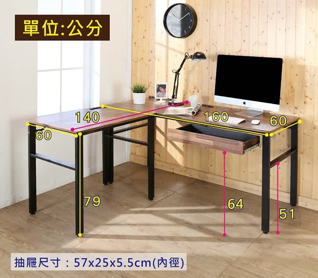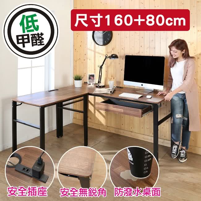 此款是特別針對高工作量使用者所設計出的《BuyJM》環保低甲醛防潑水L型160+80公分穩重型工作桌/電腦桌,特別採用雙桌面,可分開使用,超大空間再大的工作量也好發揮,品項歸位好分類不佔空間。且防潑水PVC材質設計,觸感極佳,耐用且容易擦拭, 160+80公分寬雙桌面設計,尺寸加大使用空間更多元,擺放電腦後,還有桌面空間可供閱讀、寫作使用,空間隨你需求輕鬆變。桌腳採用 50mm*25mm長方形鐵管,鋼板厚度達1.2mm耐重度跟穩定度一流。桌面板材質使用歐盟標準P2等級木板,讓消費者遠離甲醛,外型巧妙將自然與工業風鐵管元素結合,沒有突兀的不協調感,反而創造出空間的活力自信!單抽屜設計,好收納小物,增加桌面使用空間,具合格專利證書,證書號數M513939,實用性超高,經濟又實惠!