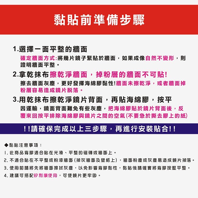 您認為壁鏡就只能單單是個鏡子嗎?那您就大錯特錯囉!現代人最講究的就是實用性,商品實用性兼具,那是再完美不過的了。推薦您此款『隨意貼壁鏡/裸鏡』超質感無框外型,可自行拼貼出自己喜歡的組合,輕鬆搭配室內氛圍,不僅增添室內美感,同時也方便您使用。壁貼設計,每片背面皆附有強力雙面貼,小坪數房間超適用,完全不用擔心佔空間的問題;每片鏡面邊緣接經過修磨處理,無銳角,超安全;精緻又美觀。實品超質感,房間只要貼上一組,不僅可以當化妝鏡、穿衣鏡,超便利。實品超美,最具時尚感的您,更是不能錯過哦!