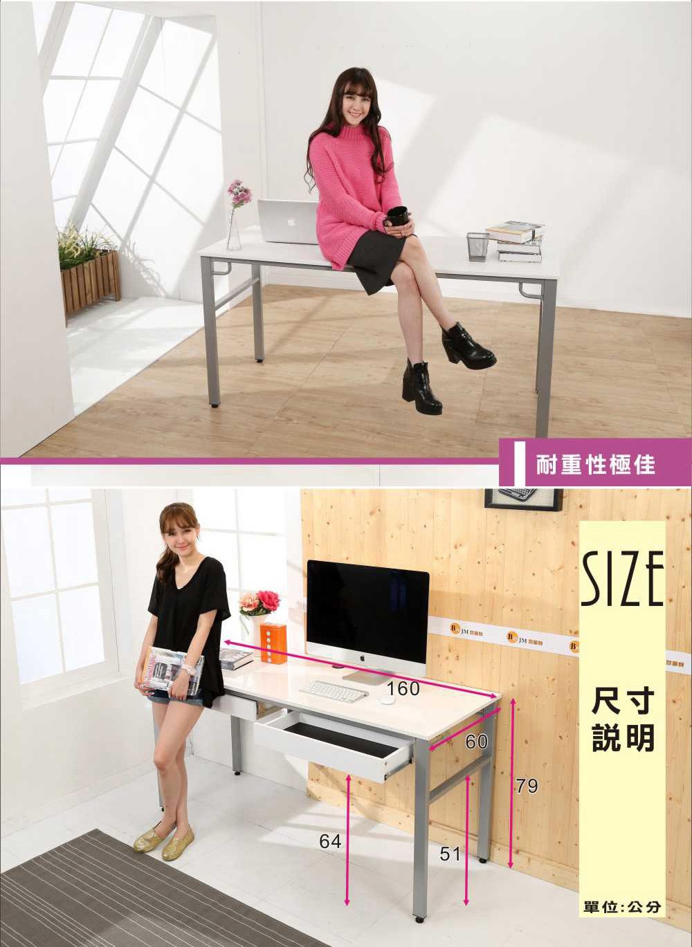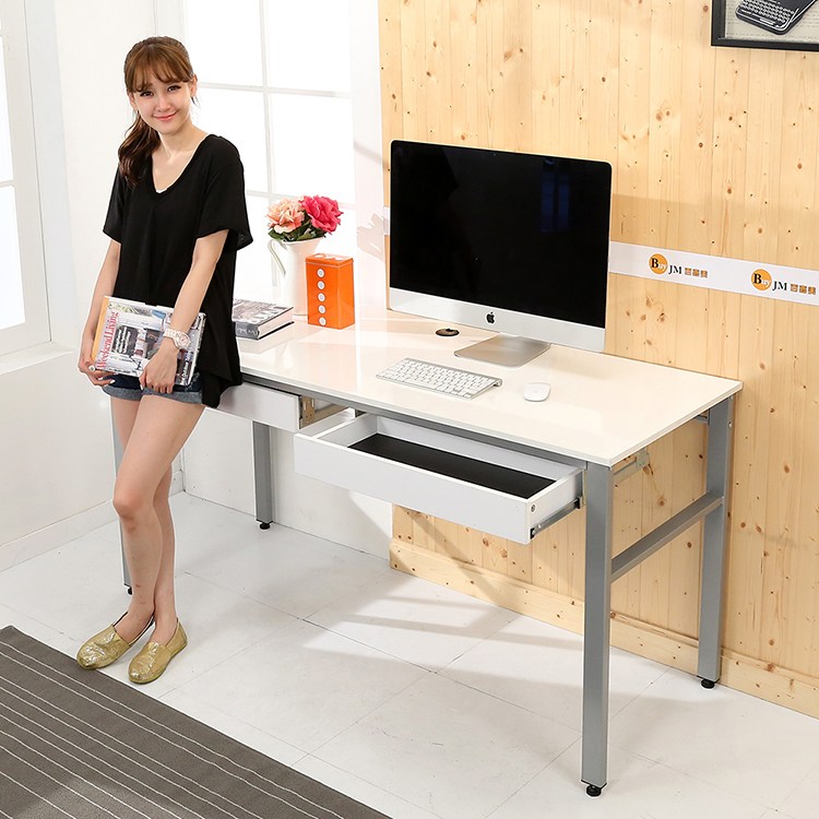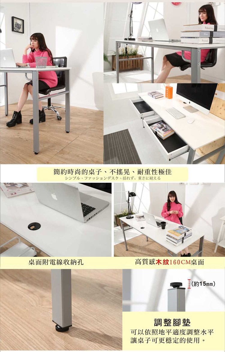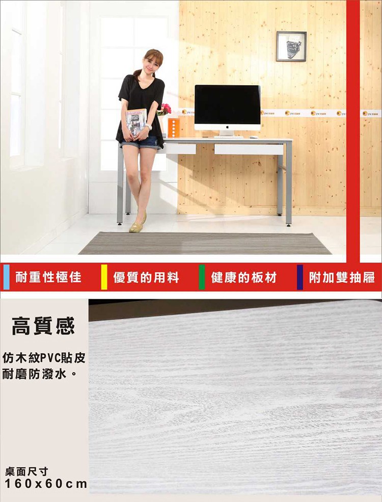 此款是特別針對小坪數房間所設計出的《BuyJM》環保低甲醛160公分工作桌/電腦桌,桌面貼木紋PVC皮,仿木紋質感, 160公分寬大桌面設計,尺寸加大使用空間更多元,擺放電腦後,還有桌面空間可供閱讀、寫作使用,空間隨你需求輕鬆變。桌腳採用 50mm*25mm長方形鐵管,鋼板厚度達1.2mm耐重度跟穩定度一流,桌面板材質使用歐盟標準E1等級木板,讓消費者遠離甲醛,外型巧妙將自然與時尚元素結合,沒有突兀的不協調感,反而創造出空間的活力自信!增加2個抽屜,讓桌子收納空間更多,實用性超高,經濟又實惠,真的是一舉兩得呢!實品超精緻,質感極佳,使用超方便,真的非常的推薦哦!