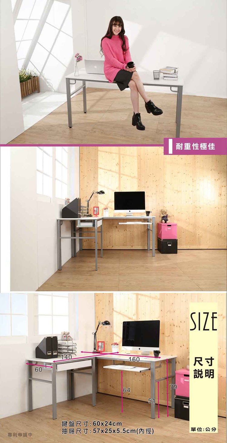 【BuyJM】低甲醛木紋白L型160+80公分附抽屜鍵盤工作桌