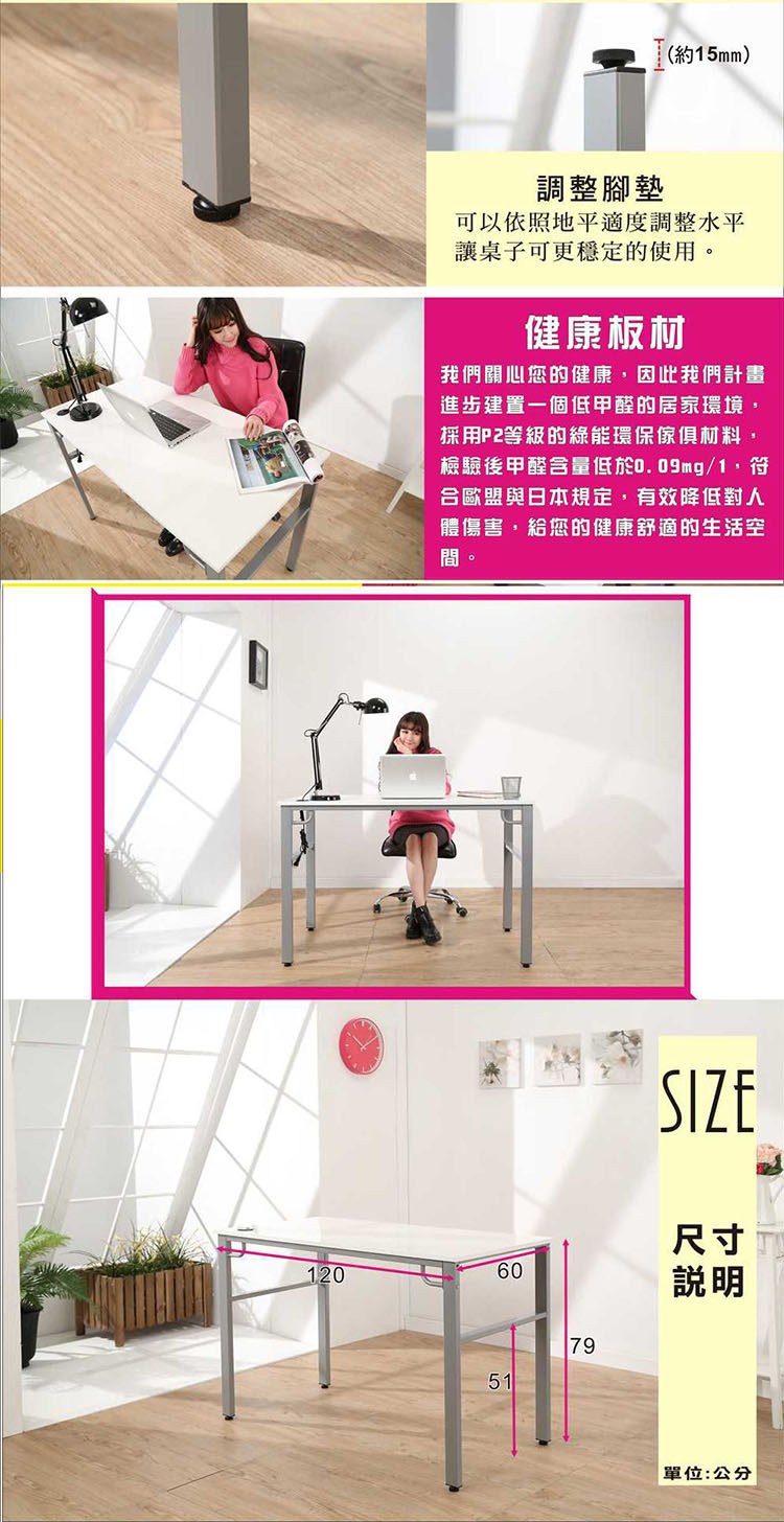 低甲醛120公分工作桌/電腦桌,120公分桌面設計,擺放電腦後,還有桌面空間可供閱讀、寫作使用,空間隨你需求輕鬆變。桌腳採用 50mm*25mm長方形鐵管,鋼板厚度達1.2mm耐重度跟穩定度一流,桌面板材質使用E1等級木板,讓消費者遠離甲醛,外型巧妙將自然與時尚元素結合,沒有突兀的不協調感,反而創造出空間的活力自信!無論平面電腦桌,工作桌可搭配,實用性超高,經濟又實惠,真的是一舉兩得呢!實品超精緻,質感極佳,使用超方便,真的非常的推薦哦!