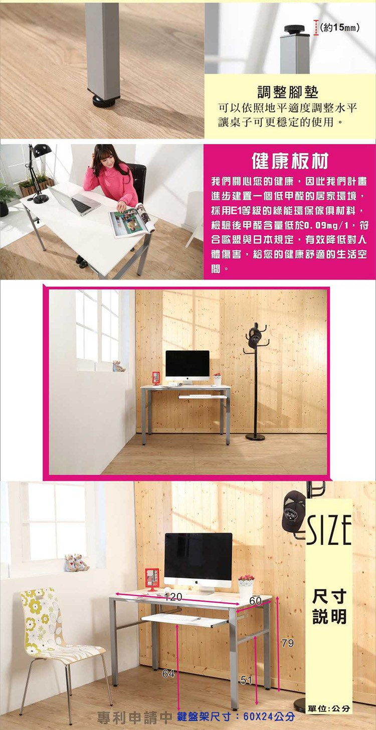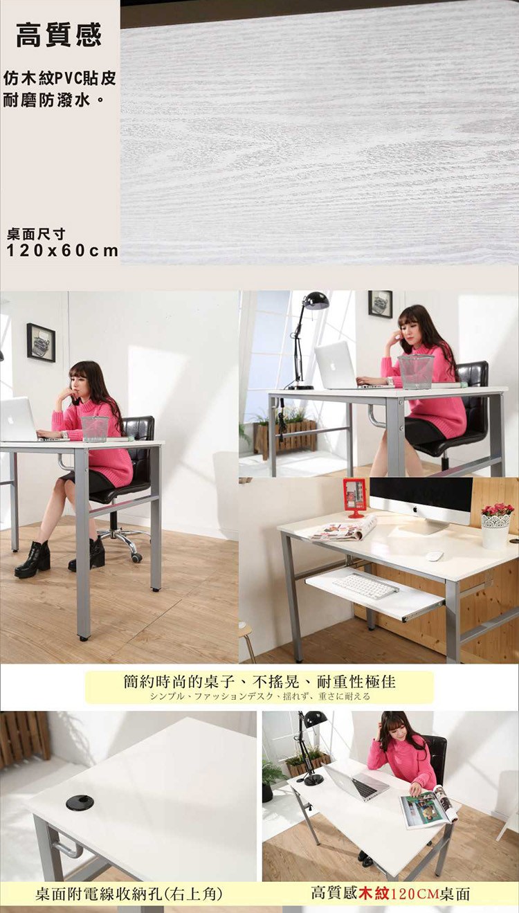 低甲醛120公分工作桌/電腦桌,120公分桌面設計,擺放電腦後,還有桌面空間可供閱讀、寫作使用,空間隨你需求輕鬆變。桌腳採用 50mm*25mm長方形鐵管,鋼板厚度達1.2mm耐重度跟穩定度一流,桌面板材質使用E1等級木板,讓消費者遠離甲醛,外型巧妙將自然與時尚元素結合,沒有突兀的不協調感,反而創造出空間的活力自信!新增鍵盤功能設計,讓桌子功能性及收納空間增加無論平面電腦桌,工作桌可搭配,實用性超高,經濟又實惠,真的是一舉兩得呢!實品超精緻,質感極佳,使用超方便,真的非常的推薦哦!
