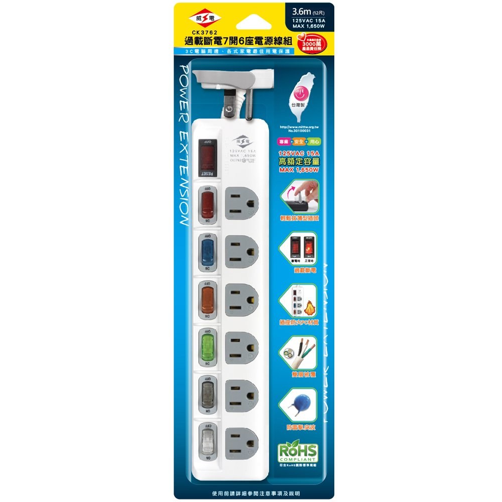 【威電】CK-3762-6 3孔7開6座 防雷擊 突波 電腦 延長線 6尺/1.8M(平貼 拉環 插頭 好拔 過載斷電 電源線組)
