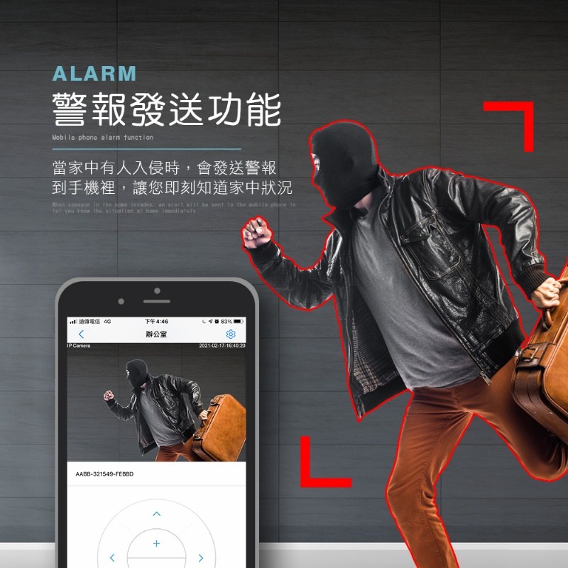 5.警報功能: 移動偵測警報/ 聲光警報/ 警報推送APP /警報抓拍傳送Email / 警報錄影