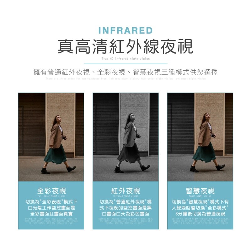 10.真高清紅外線夜視: 三種夜視模式(普通/全彩/智慧)