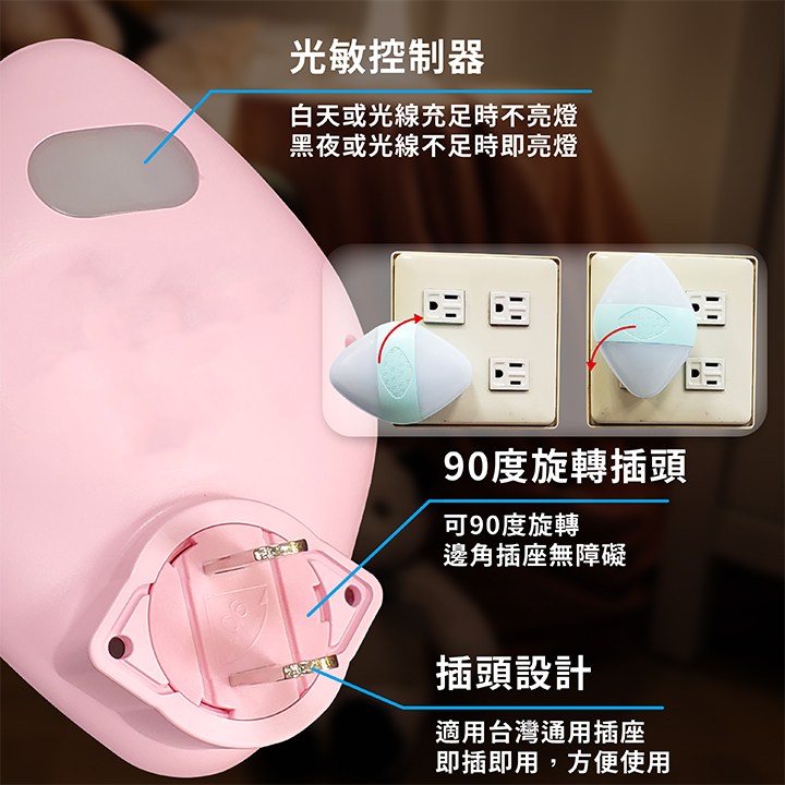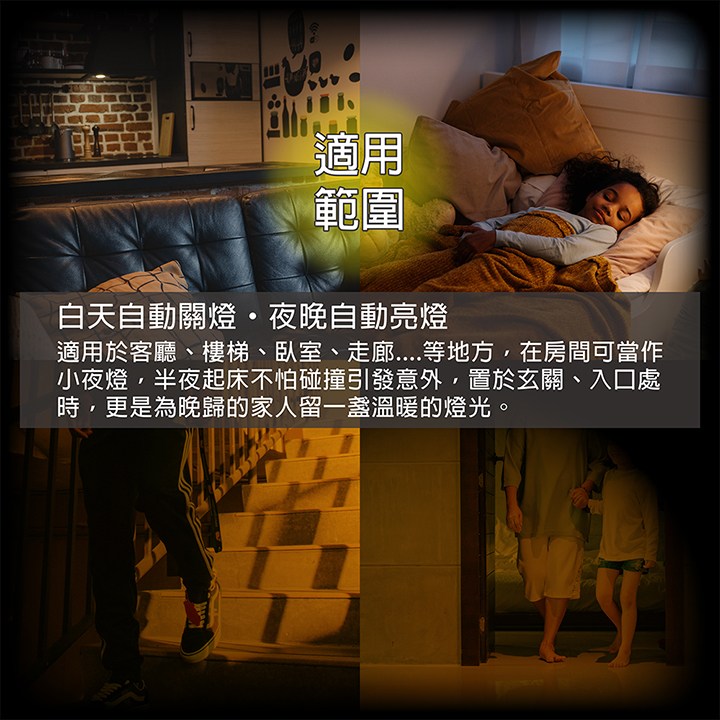 - 當光線大於7LUX時,小夜燈不啟動呈待機狀態,光線變暗時,小夜燈自動亮燈。