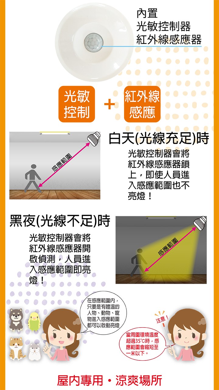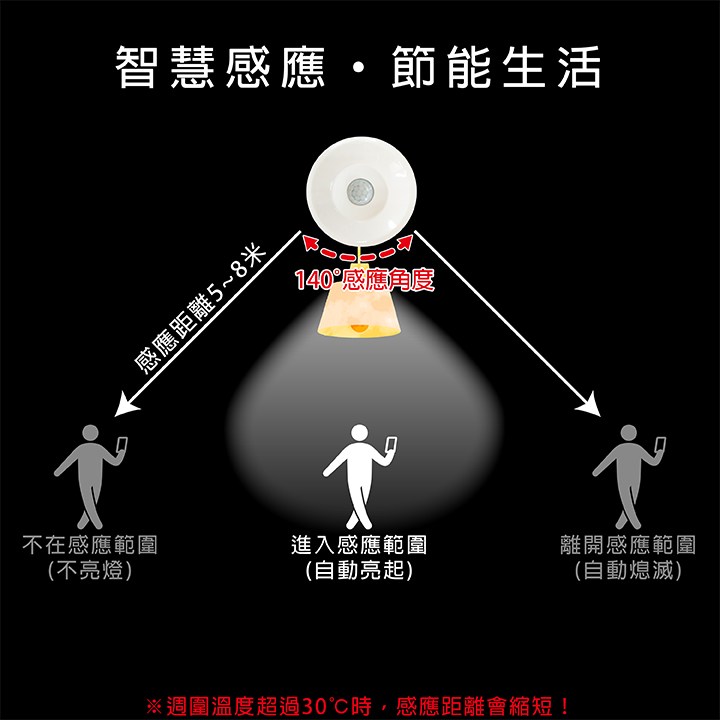 - 內置紅外線人體感應器,當人體進入感應範圍時自動啟動(亮燈),離開時自動延時關閉