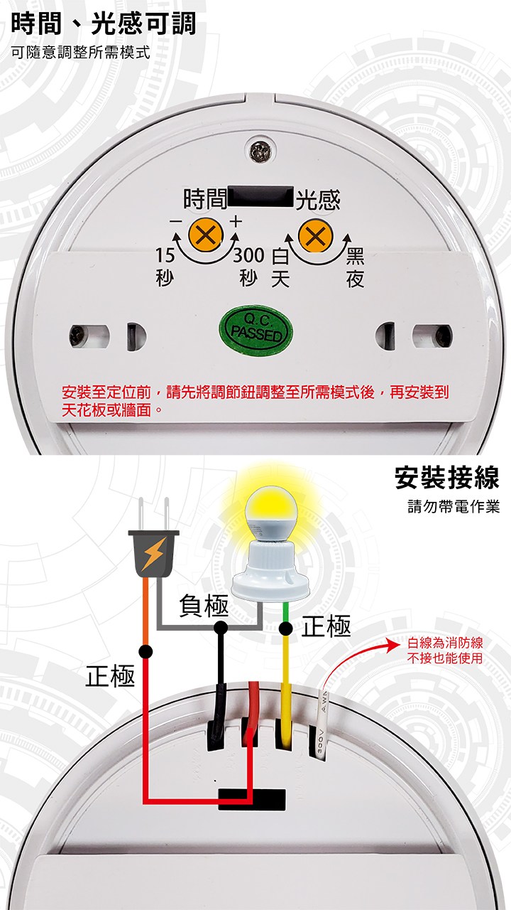 - 光感度可調,可調全天候或黑夜(光線不足)時啟動亮燈。