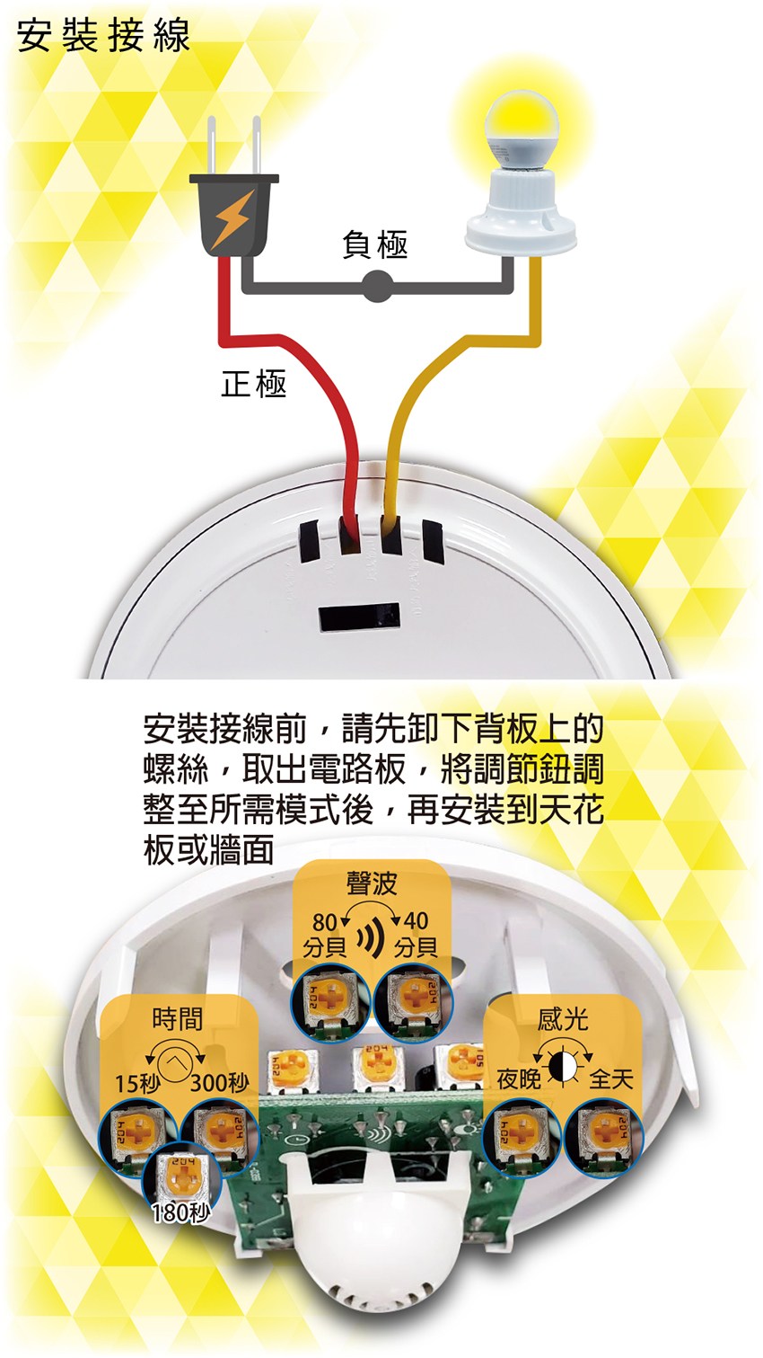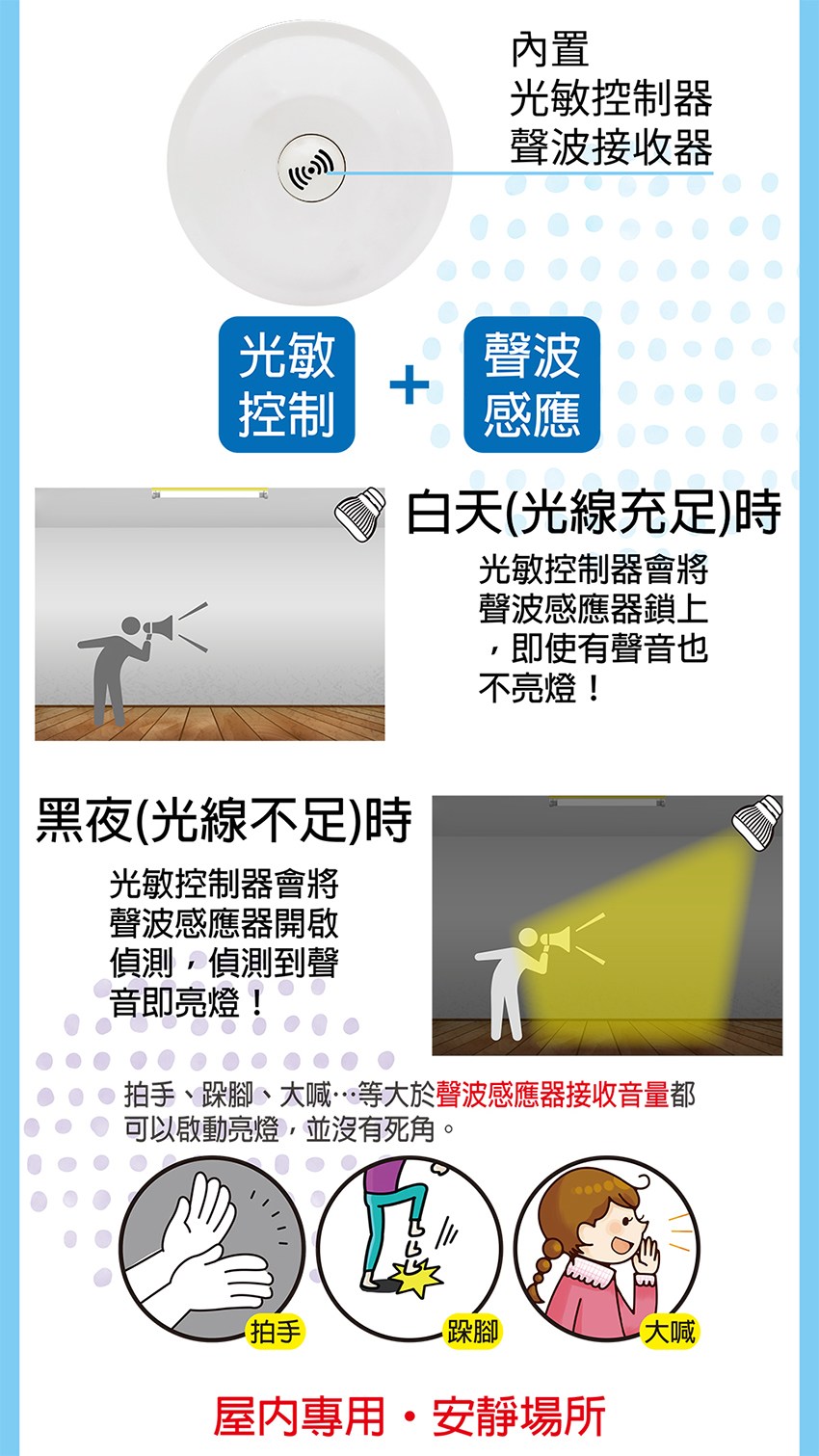 - 聲波靈敏度可調-可調啟動亮燈的音量大小。