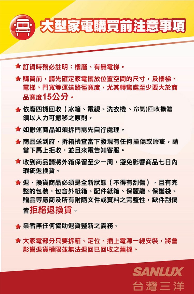 ◎大型家電為專車配送出貨,廠商收到訂單後(不含假日),將有專人與您聯繫確認訂單資訊及環境尺寸評估等(前置作業),客人需如實告知現場情況,若未如實告知產生費用,例如 : 需拆窗或商品抬過腰(一些特殊情況)都會產生額外費用 (請現場支付給師父),請務必保持電話暢通,若無法聯繫將無法安排出貨,則影響配送時間。