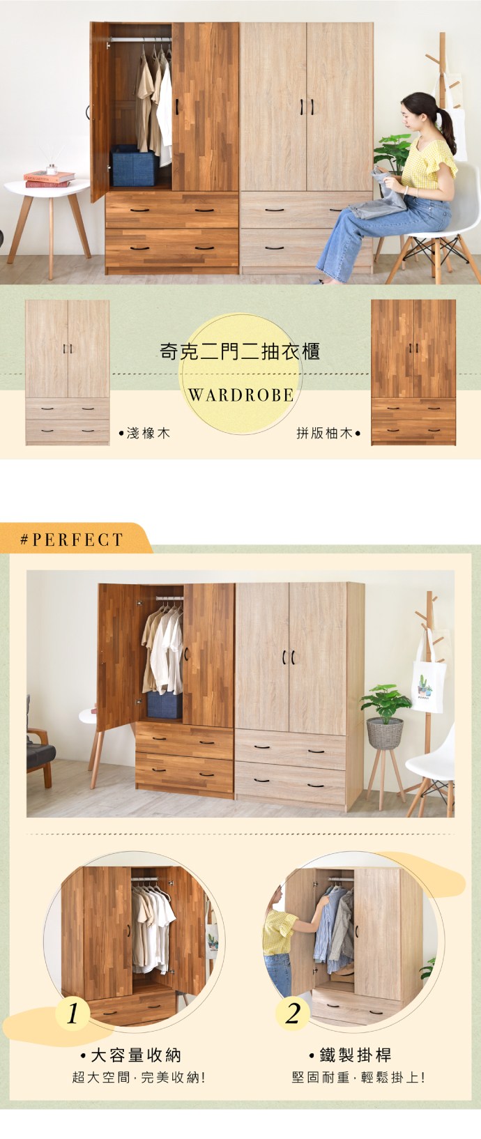《HOPMA》美背奇克二門二抽衣櫃 台灣製造 衣櫥 抽屜櫃 衣物收納櫃-拼版柚木