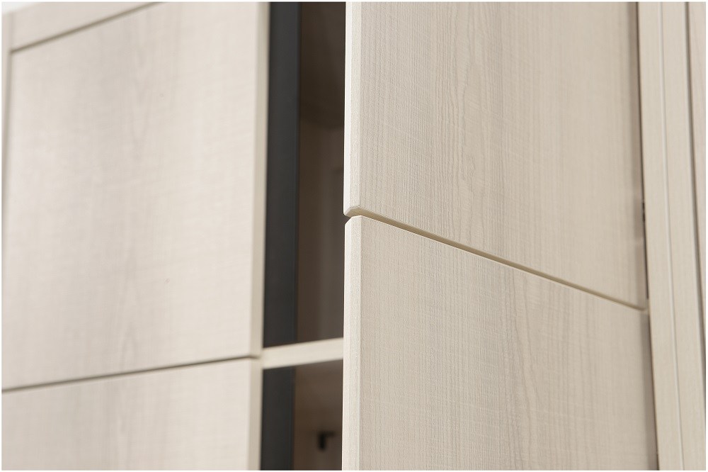 衣櫃門片斜手把設計含鋁合金黑色飾條。