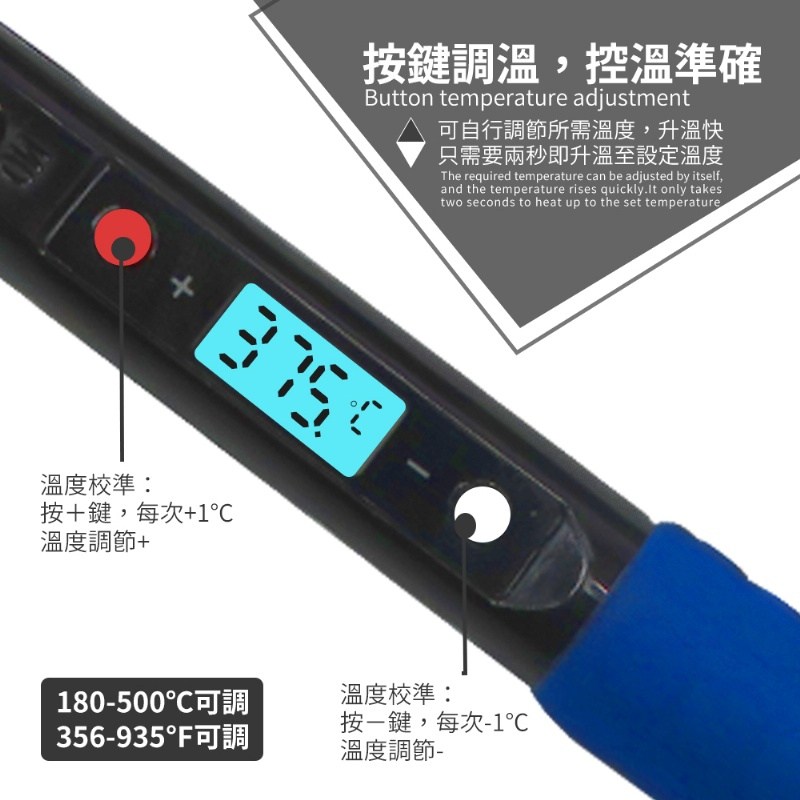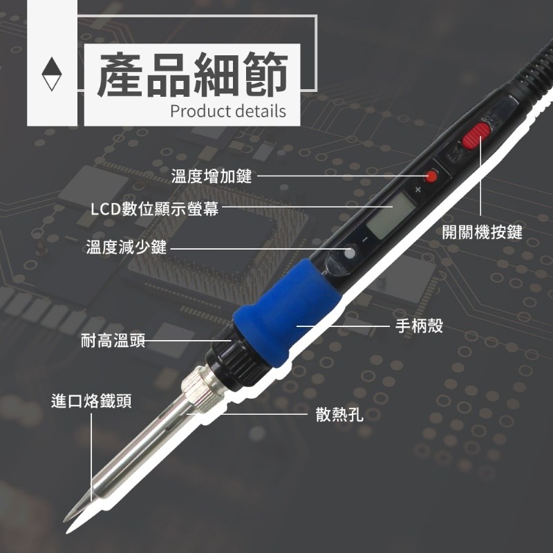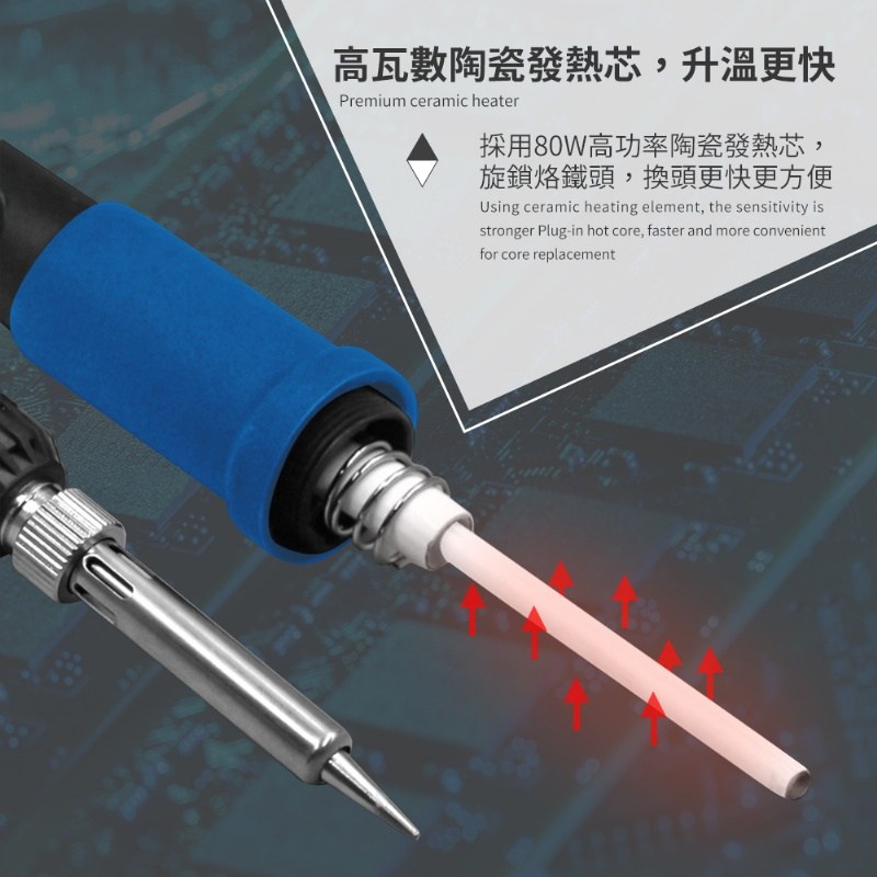 產品特點: 1.帶有開關更方便 2.陶瓷頭發熱 3.功率80w升溫快 4.自動補溫 5.溫度更準確 6.溫度可調180°c~500°c 7.液晶螢幕顯示溫度 8.焊頭可換設計 |