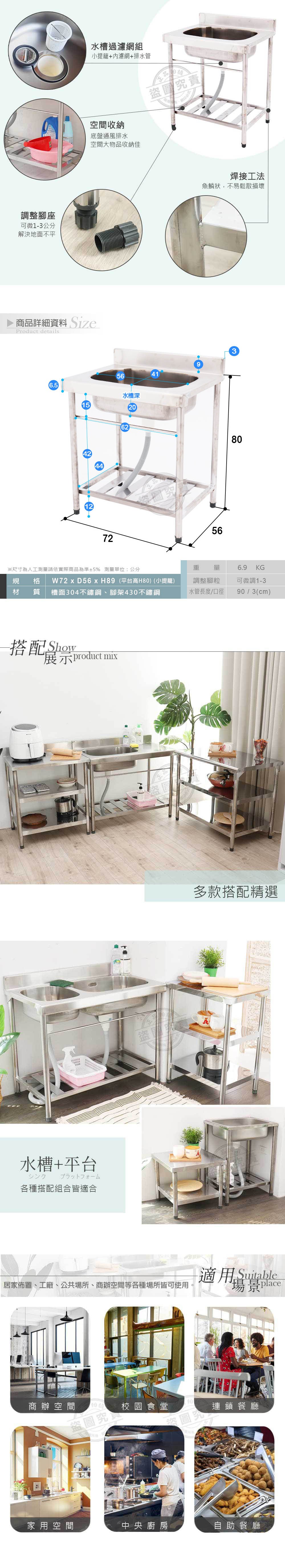 【Abis】頂級升級加牆款304不鏽鋼72CM洗台大水槽(2.4尺)
