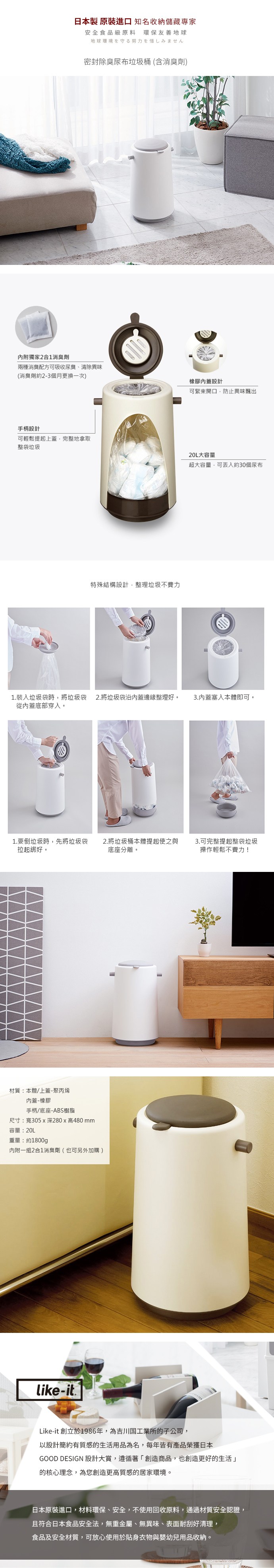 like-it 密封除臭廚房 尿布垃圾桶 含2合1消臭劑 白灰色 20L