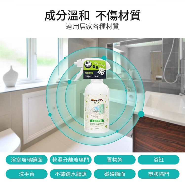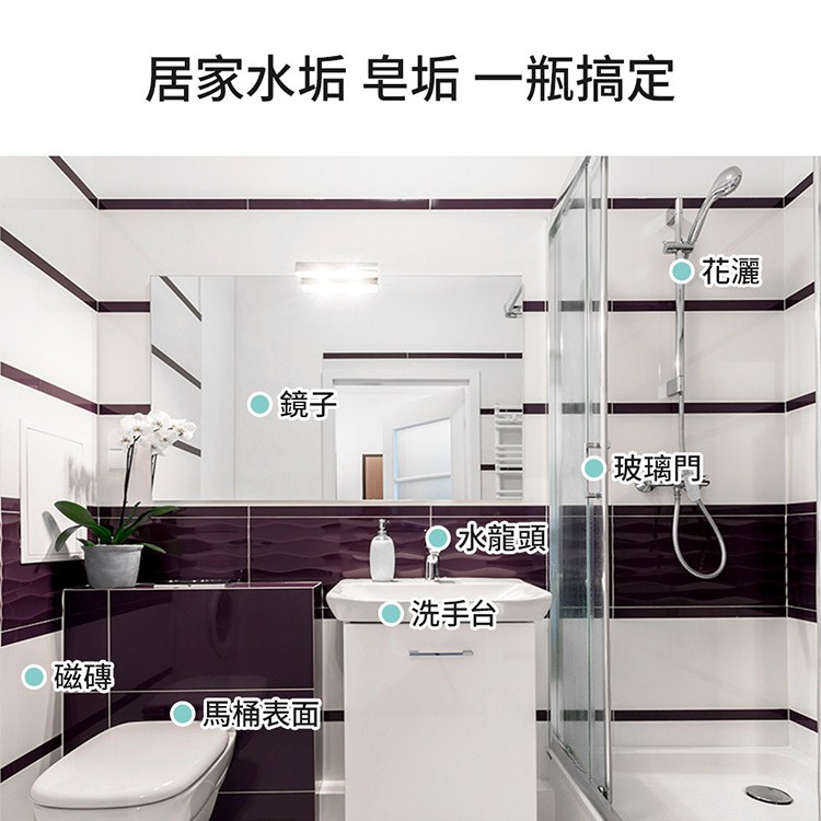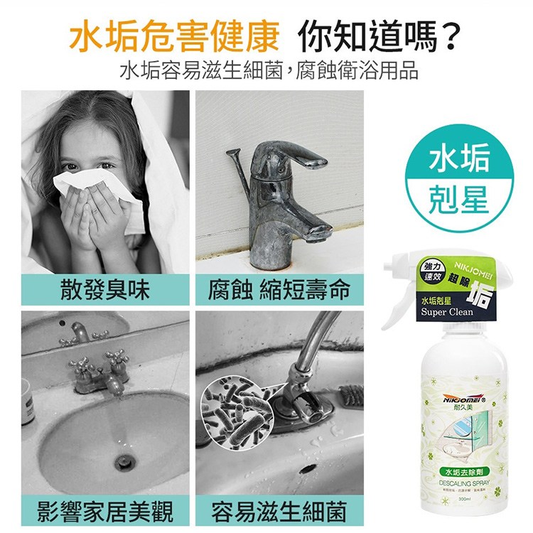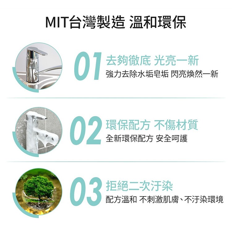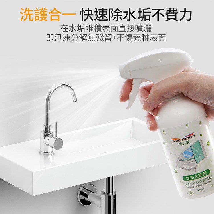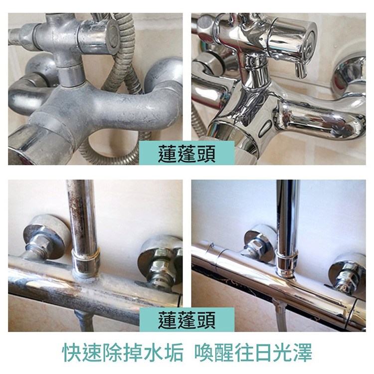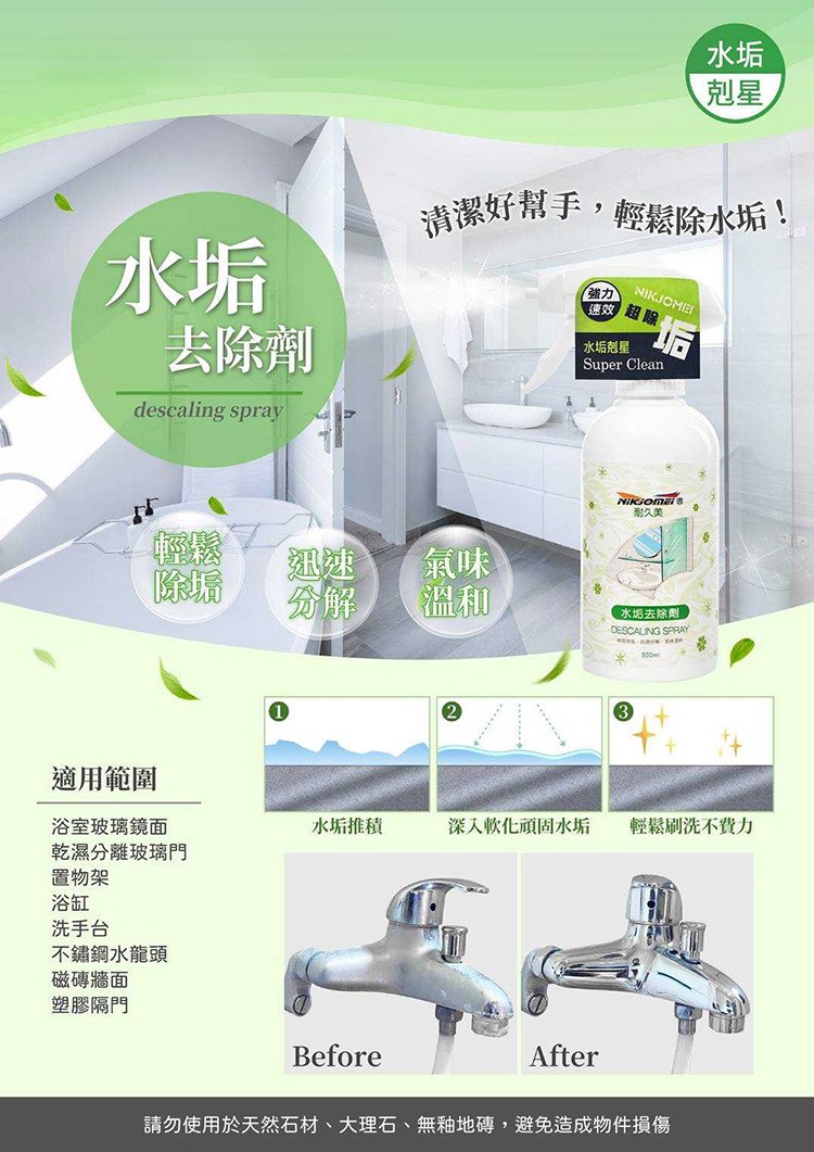 3.如有較重之陳年水垢,噴灑後可靜置3~10分鐘再刷洗,請重複2~3次即可將積垢程度降低。(清洗完成後請充分沖洗,避免殘留造成表面損傷)