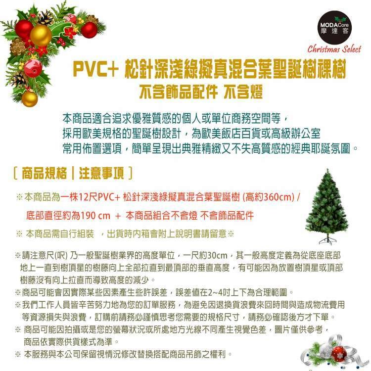 台灣製12尺/12呎(360cm)特級綠色松針葉聖誕樹裸樹 (不含飾品)(不含燈) (本島免運費)