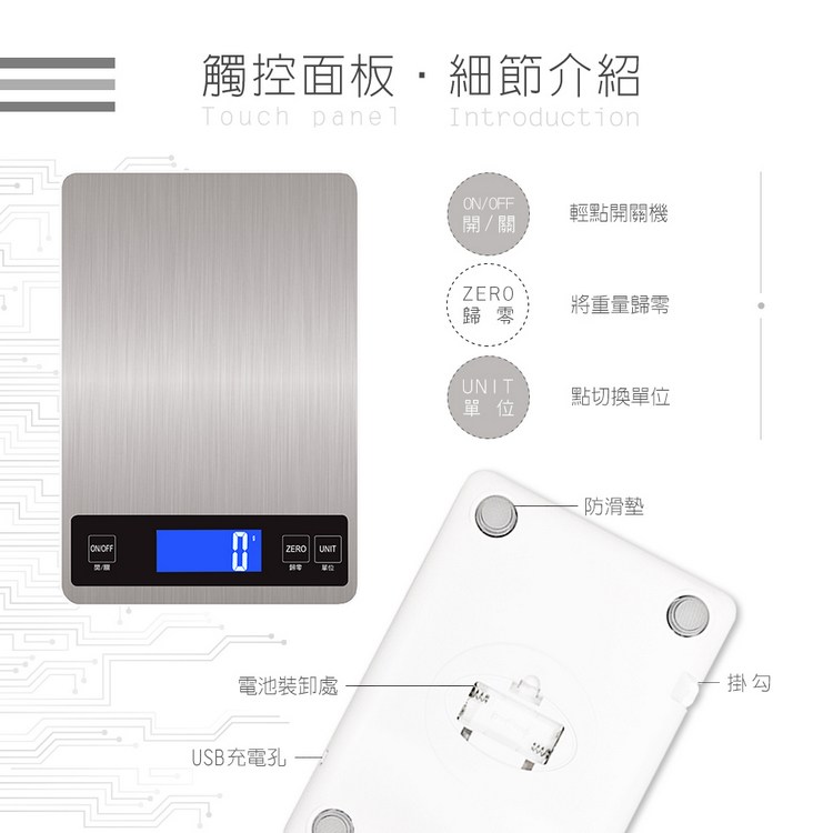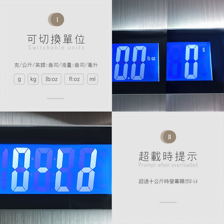 9.可切換單位:g/ kg/ ibOz/ ml/ floz