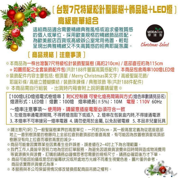 摩達客耶誕-台灣製7尺(210cm)特級綠松針葉聖誕樹+高級聖誕花蝴蝶結系配件+100燈LED燈暖白光2串(附控制器)豪華組 飯店級(本島免運費)