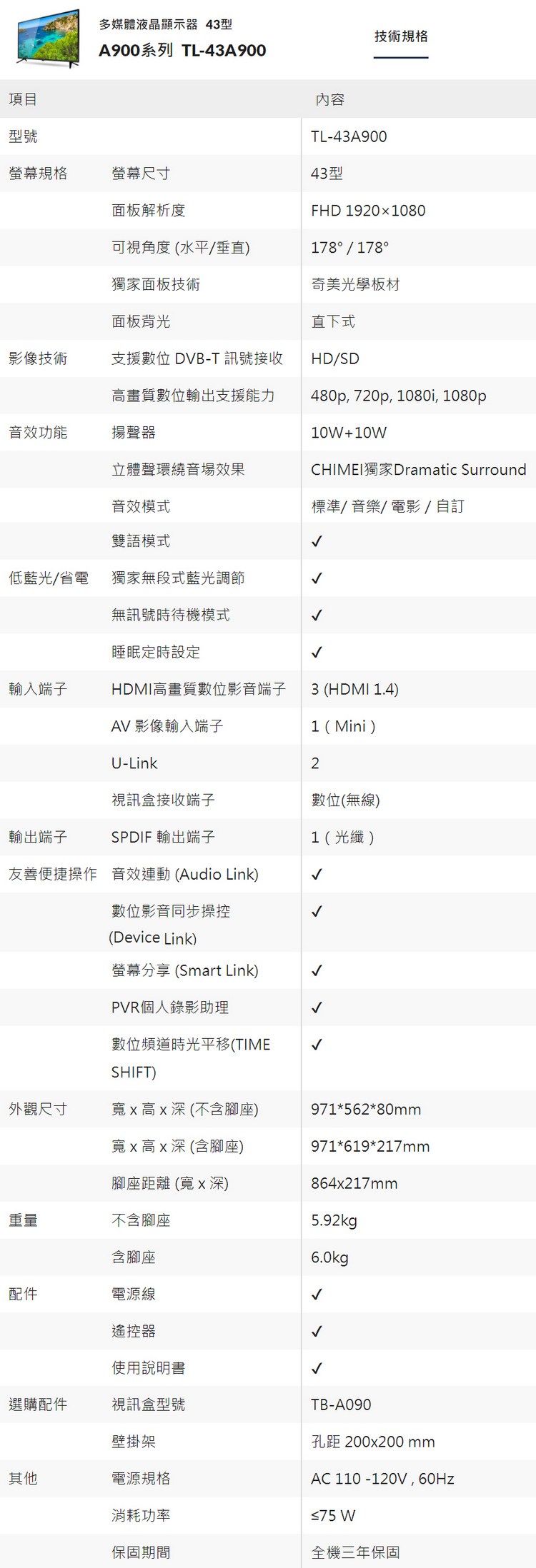 CHIMEI奇美 43吋低藍光液晶顯示器+視訊盒 TL-43A900~含運不含拆箱定位