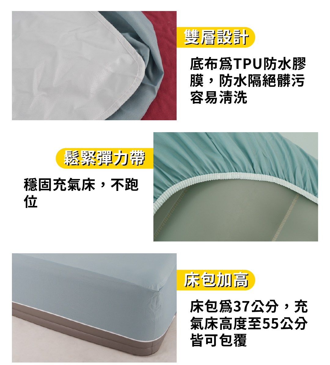充氣床/睡墊/床墊專用床包/保潔墊,表布3M吸濕排汗透氣輕微防刮,表布抗菌處理,底布TPU防水膠膜,防水隔尿,充氣床不易損壞,床包清洗方便。