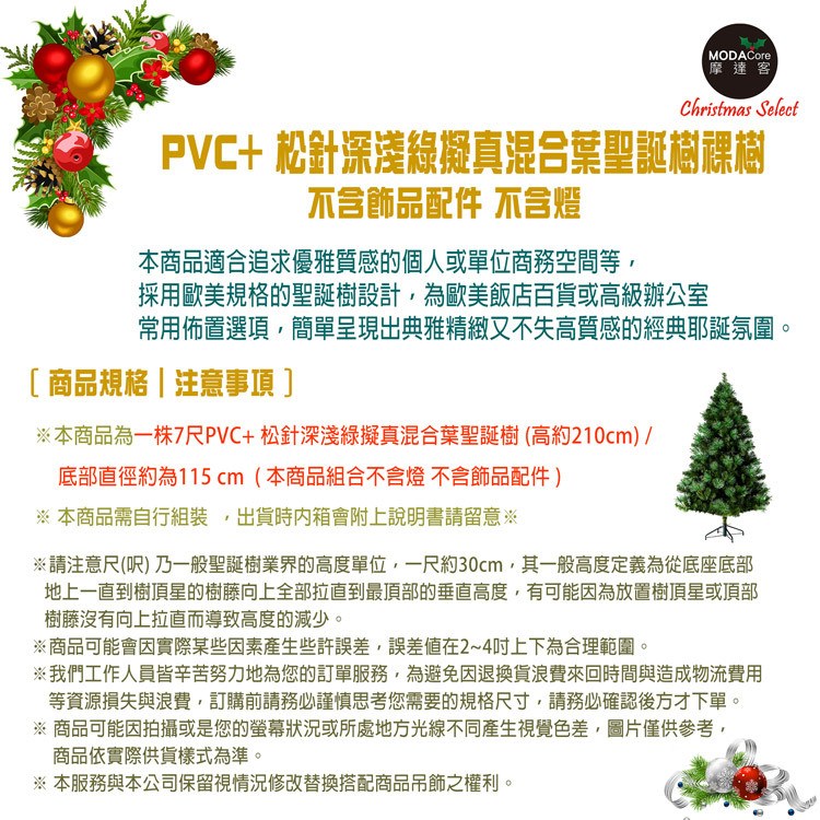 摩達客★台灣製7呎/7尺(210cm)PVC+ 松針深淺綠擬真混合葉聖誕樹 裸樹(不含飾品不含燈)