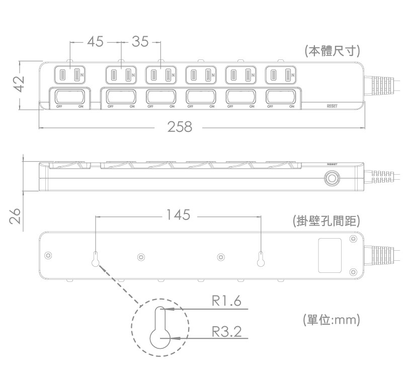 .本體尺寸:長 258mm x 寬 42mm x 高 26mm