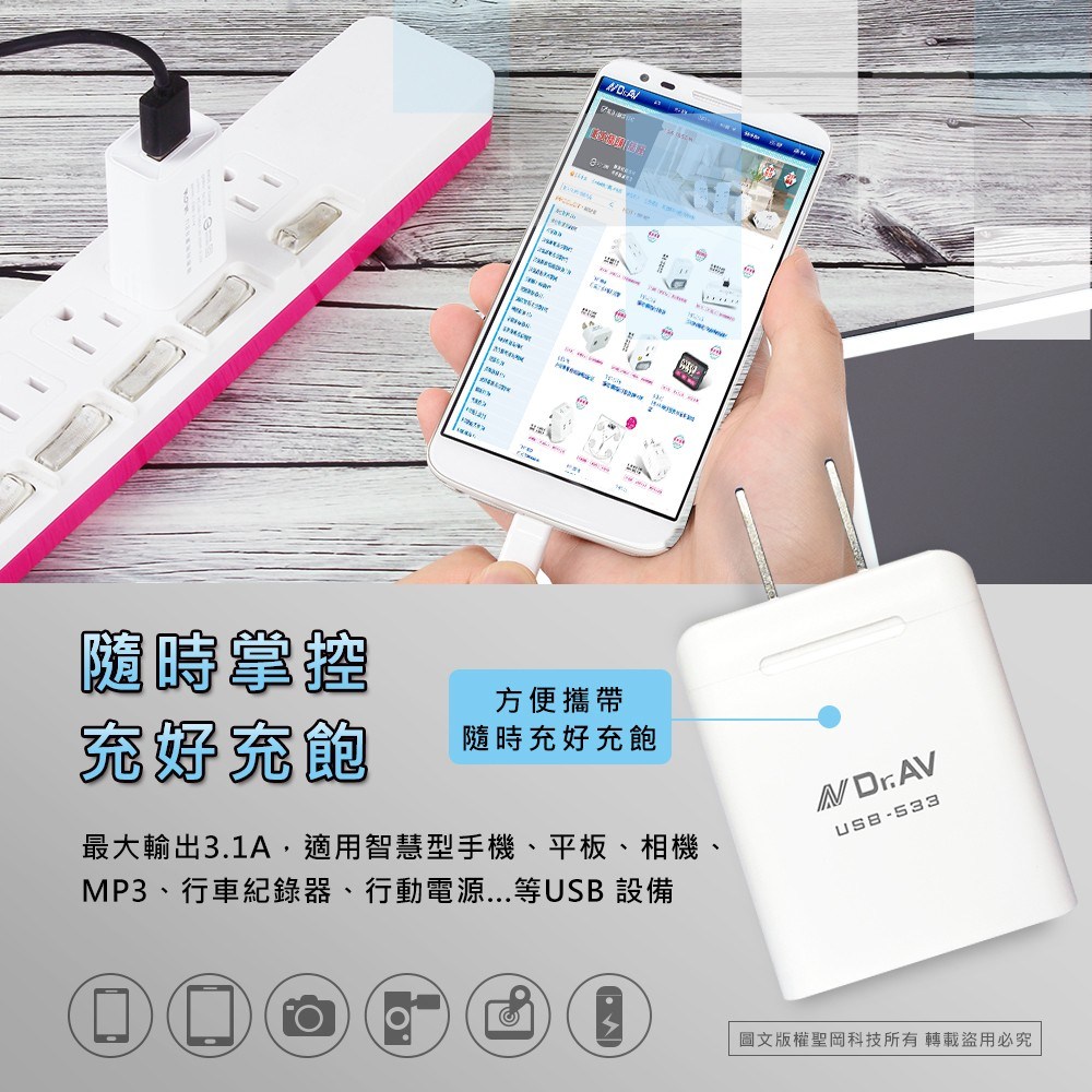 【聖岡科技Dr.AV】USB-533極速3 USB快充3.1A充電器(自動辨識iPhone android五大安全保護 國際電壓設計)