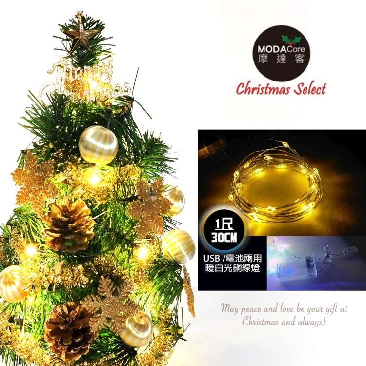 摩達客 耶誕 1尺(30cm) 迷你裝飾聖誕樹 (木質雪花系) LED20燈銅線燈(暖白光/USB電池兩用充電) 綠色 + 紅色 + 金色 1組
