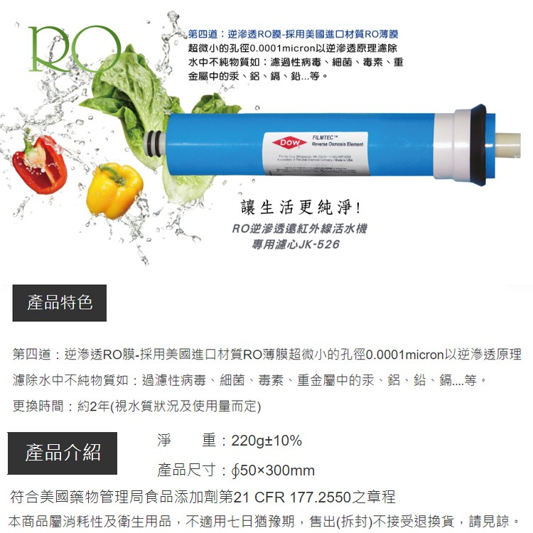 晶工RO逆滲透膜濾心 JK-526 (適用晶工PW3620/Jk-237淨水器)