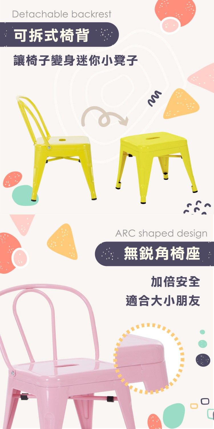 圓弧鏤空椅背造型,透氣可倚靠,椅背可以分離,變身迷你小凳子,無銳角椅座設計,適合大小朋友,