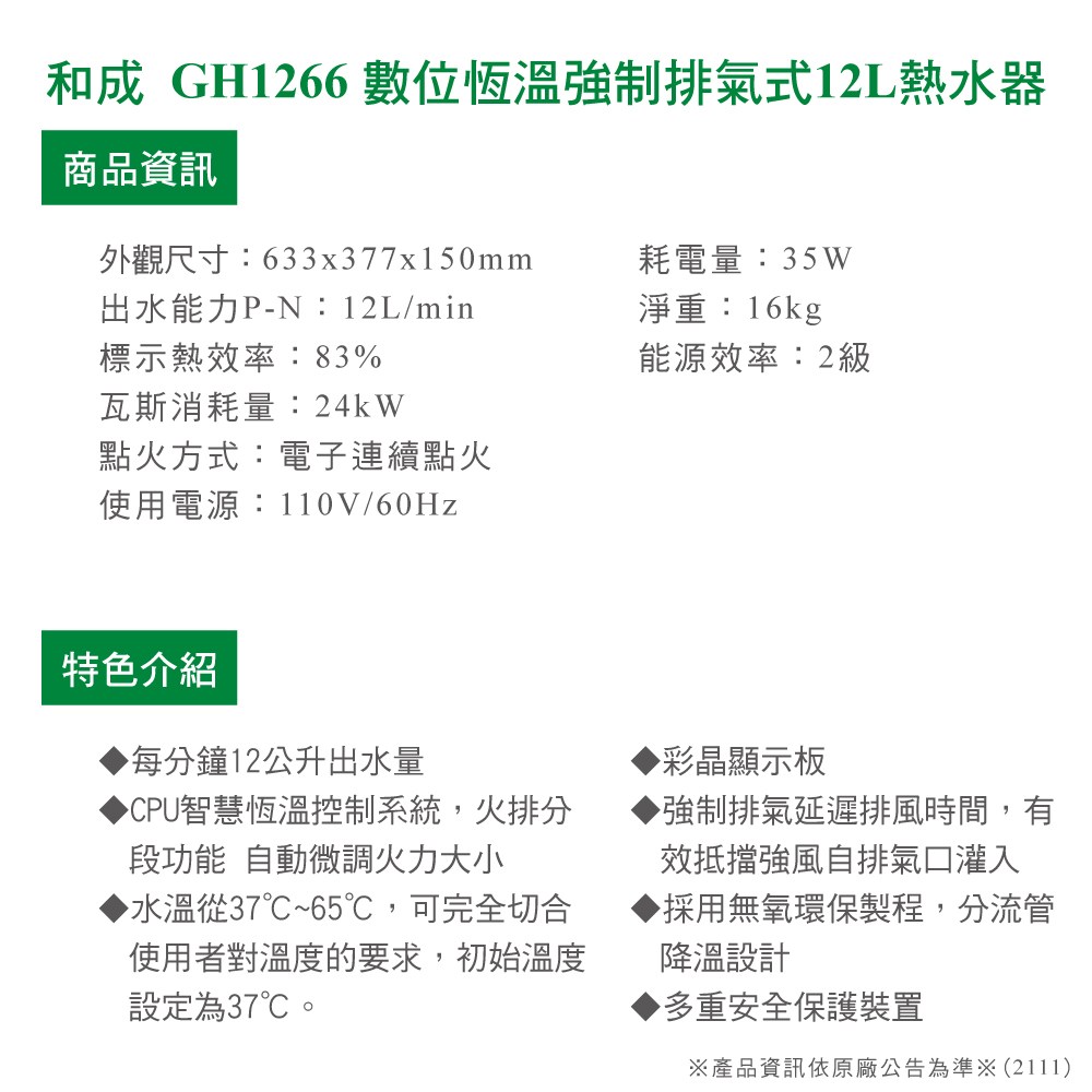 和成瓦斯熱水器 GH1266(NG1/FE式)強制排氣式12L_天然【全省安裝】