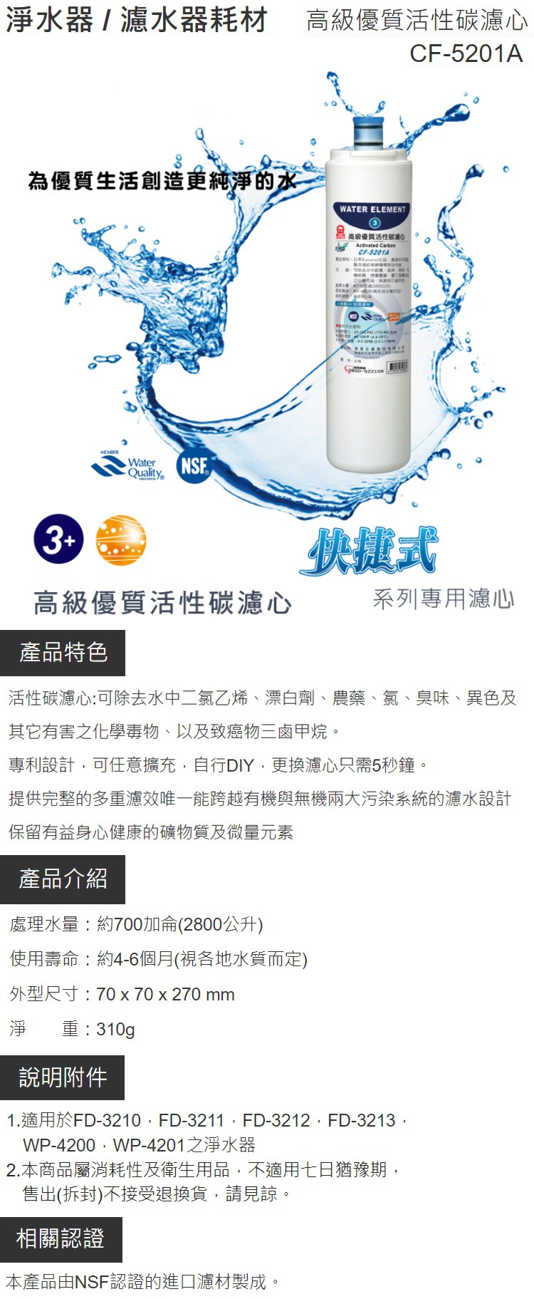 晶工快捷式高級優質活性碳濾心 CF-5201A
