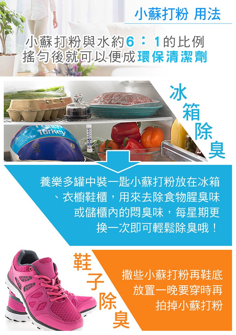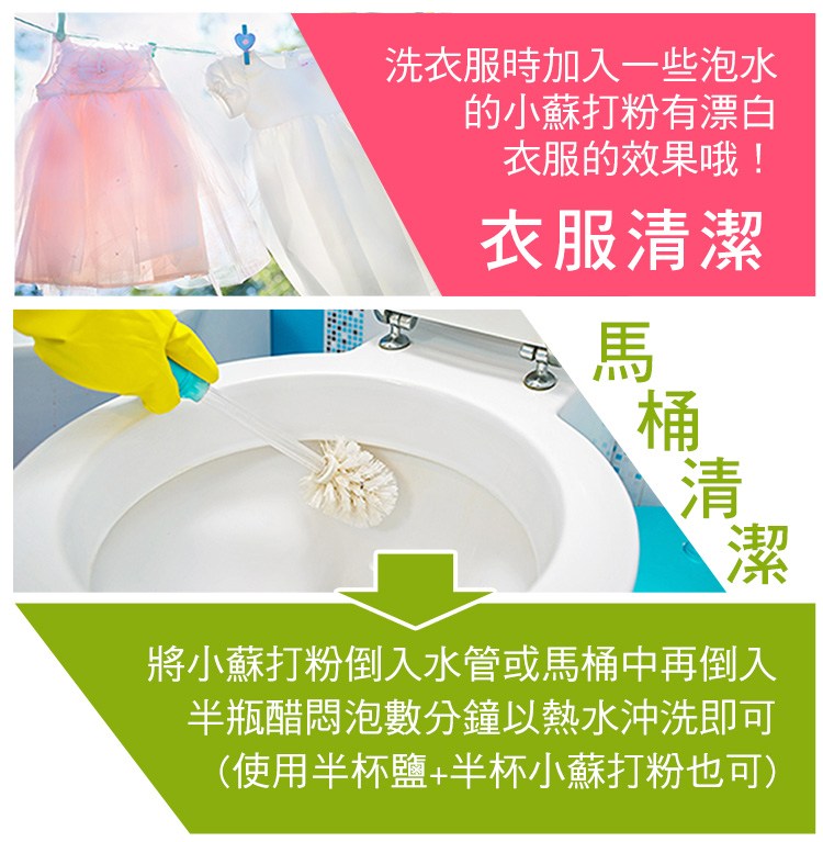 ◆清洗蔬果:加入一匙小蘇打粉攪拌,洗滌蔬果表面或浸泡2-3分鐘