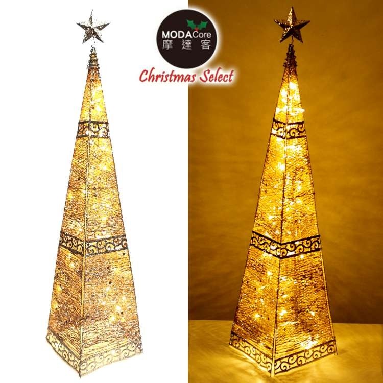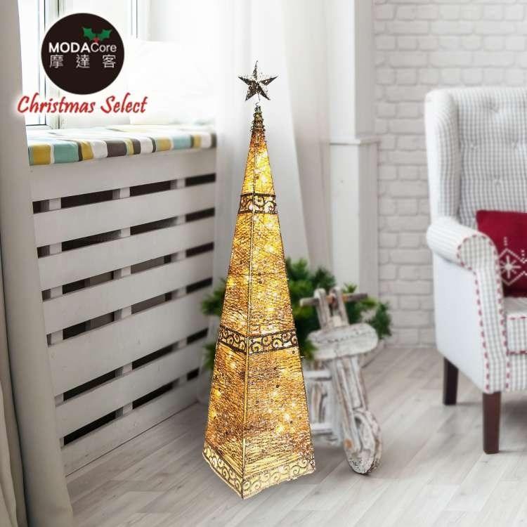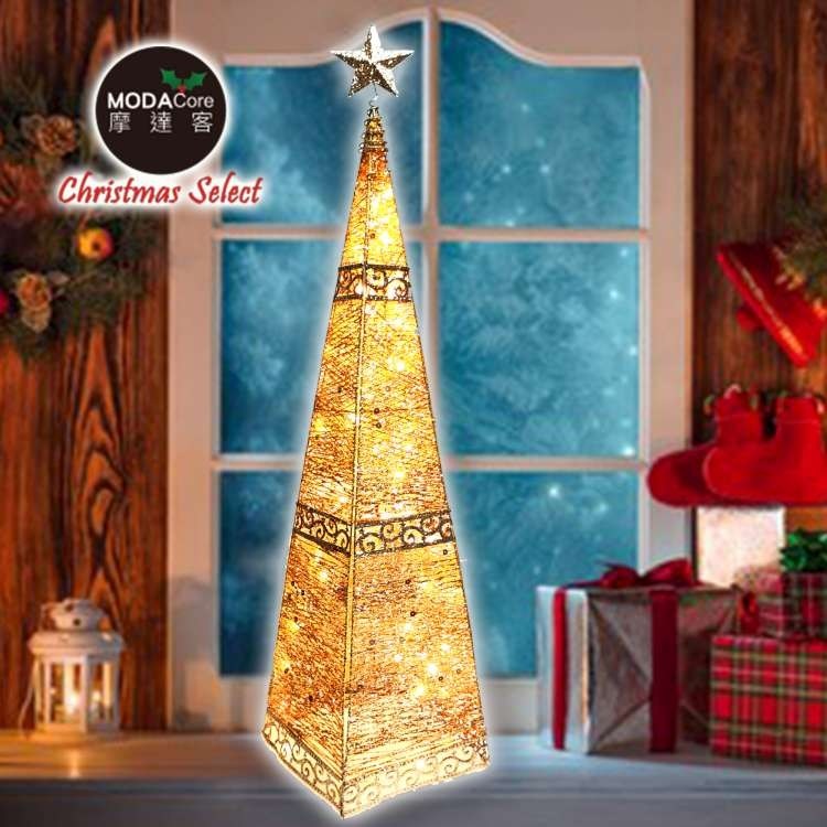 摩達客90cm聖誕裝飾四角樹塔(金色系)+LED30燈暖白光插電式燈串
