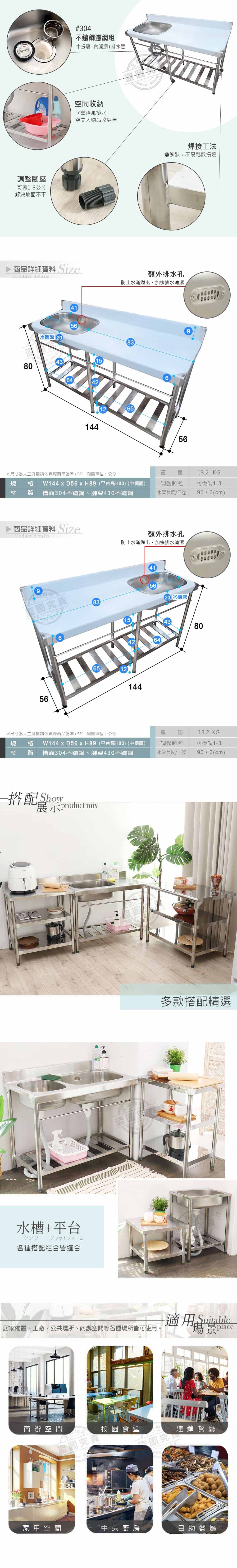 【Abis】加牆款左右兩用304不鏽鋼平台加深水槽144公分/4.8尺左槽