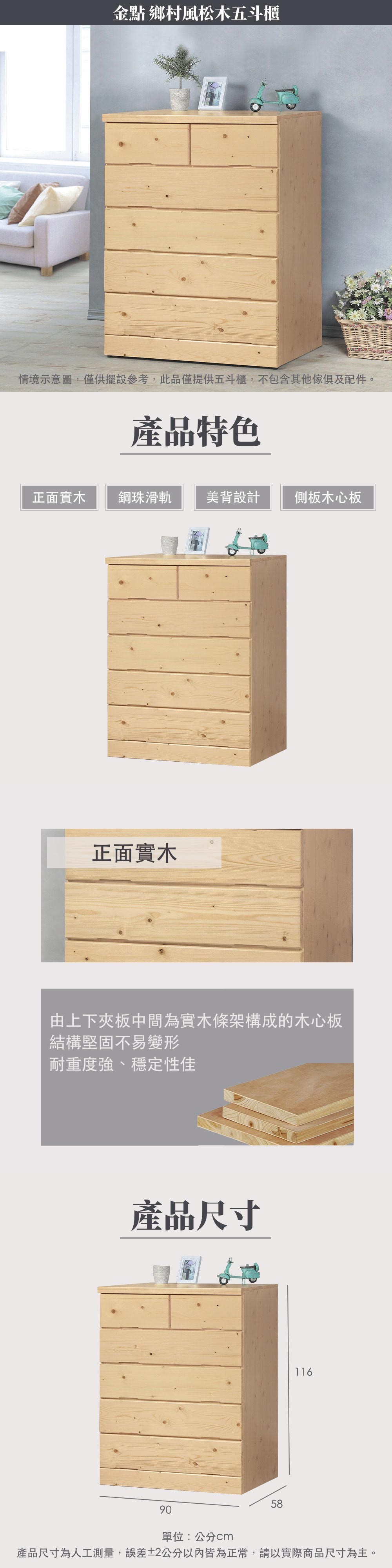 柏蒂家居-卡維3尺松木四斗櫃/五抽收納置物櫃-90x58x96cm