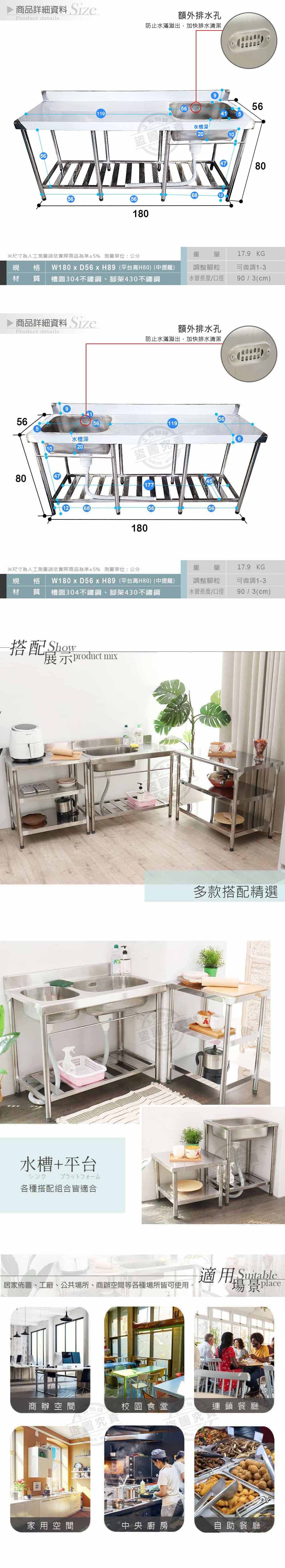 【Abis】客製商品-頂級升級加牆款304不鏽鋼180CM單洗台+平台水槽/洗手台/洗碗槽/洗衣槽/流理台(6尺)-中槽