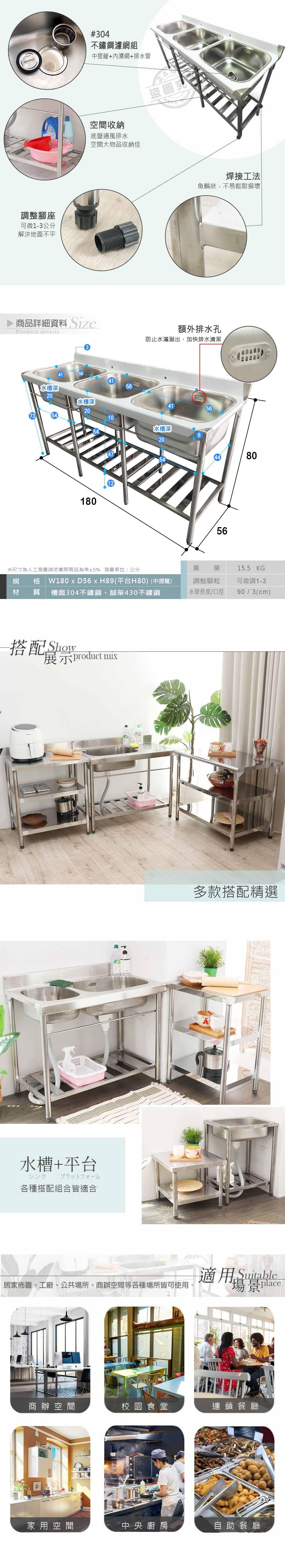 【Abis】客製商品-頂級升級加牆款304不鏽鋼180CM雙洗台+平台加深大水槽/洗手台/洗碗槽/洗衣槽/流理台(6尺)-左右槽
