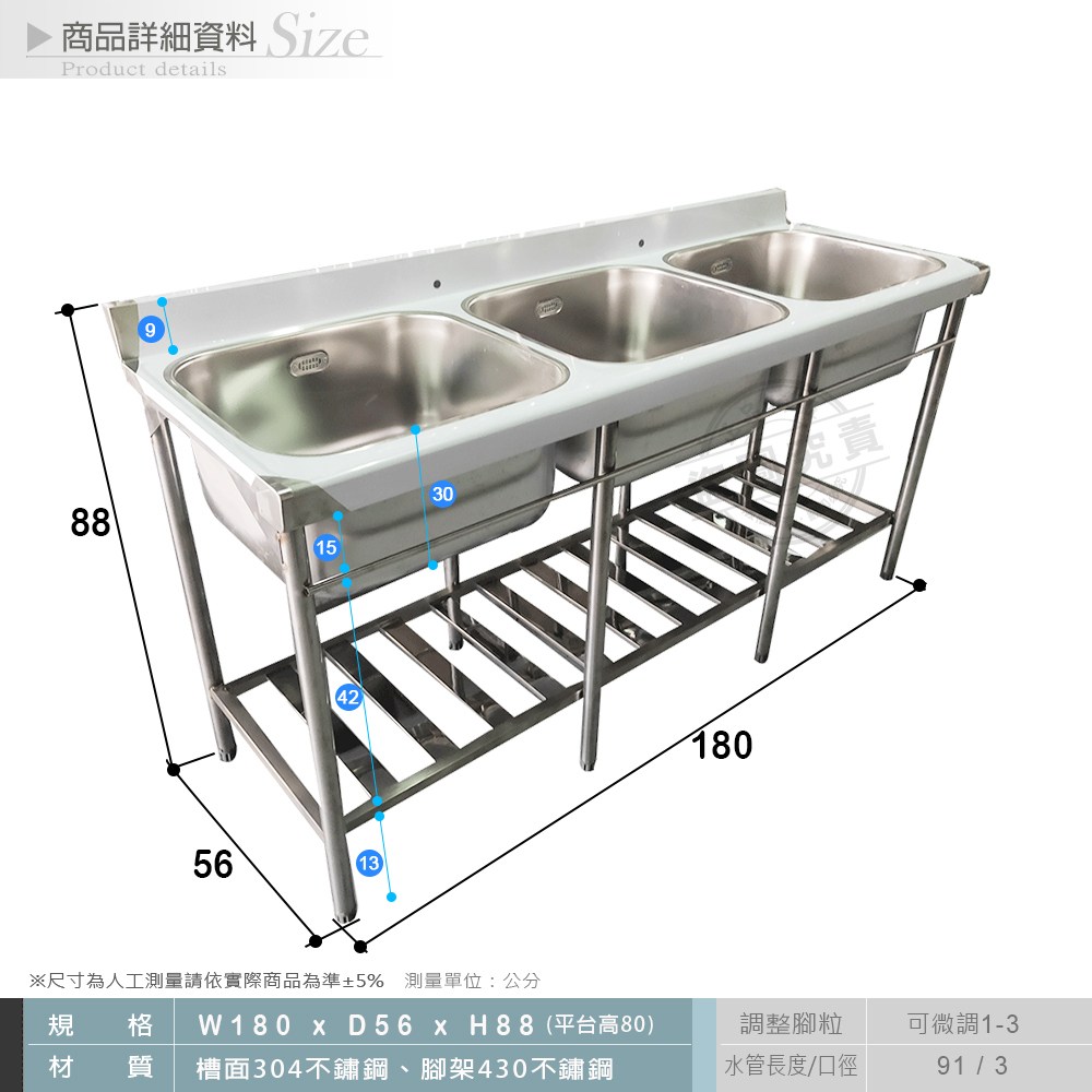 【Abis】加牆款304不鏽鋼三洗台加深水槽(180公分/6尺)-1入